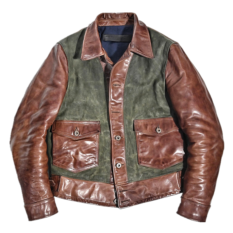 Day Series Retro Men's Clothing Old Waxy Dyeing Head Layer Marpi Splicing Canvas Flap jacket Leather Leather Clothing for short-leather leather