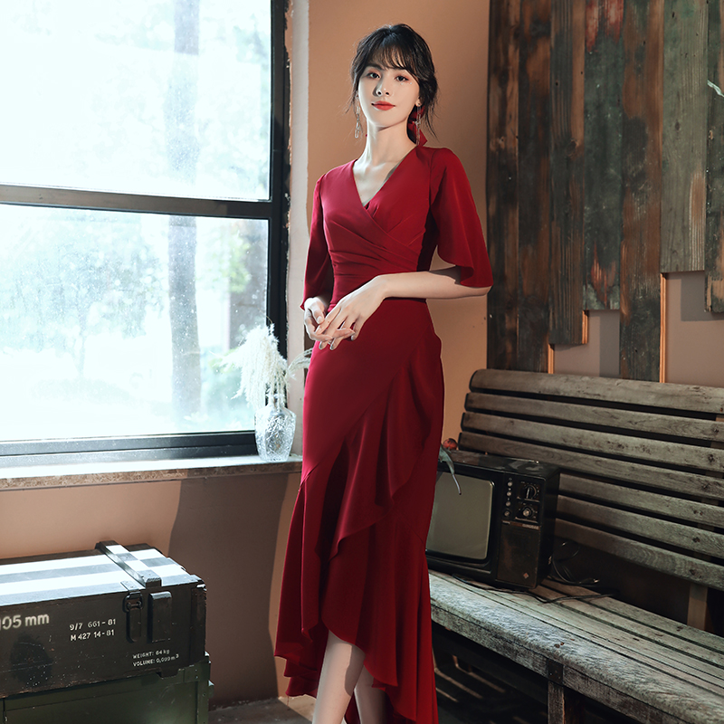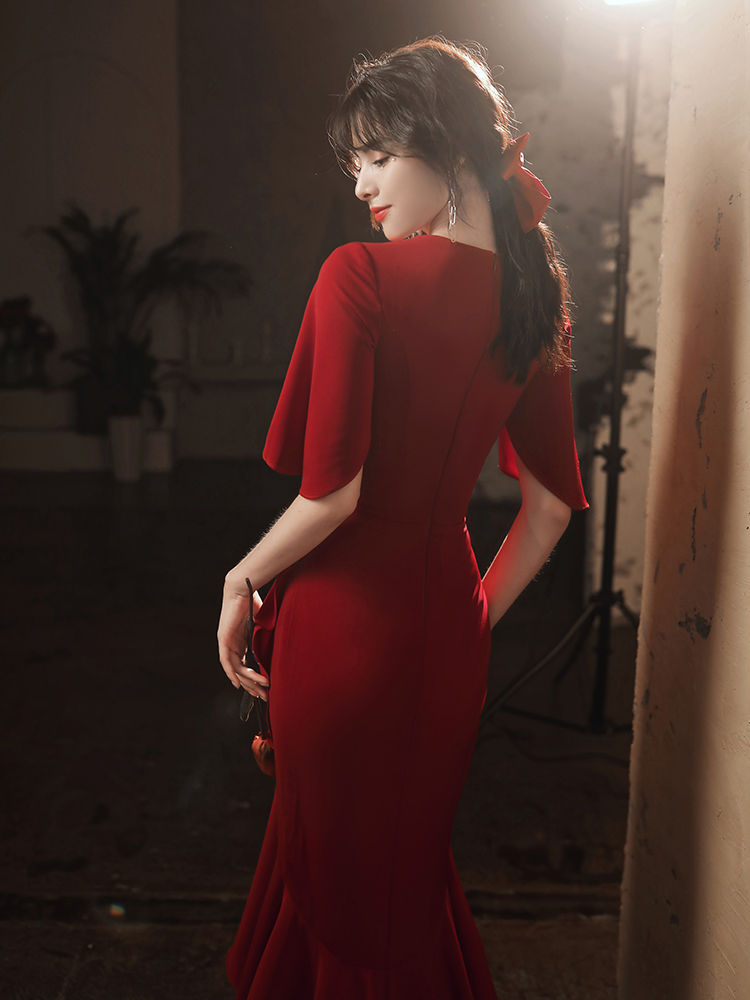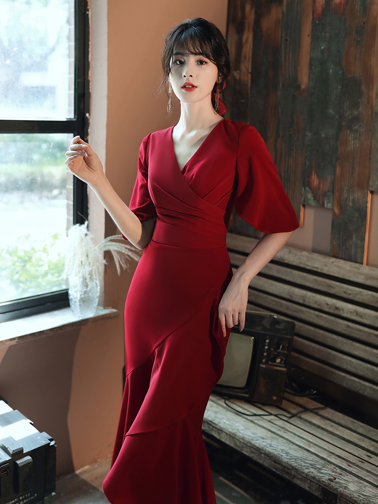 High-end fishtail wedding toast dress 2022 new temperament V-neck slim banquet wine red evening dress mid-length version