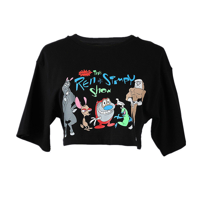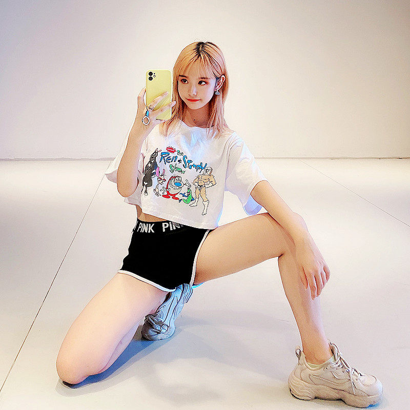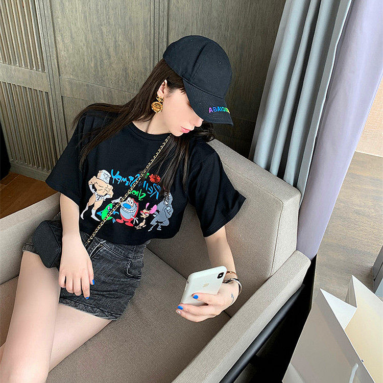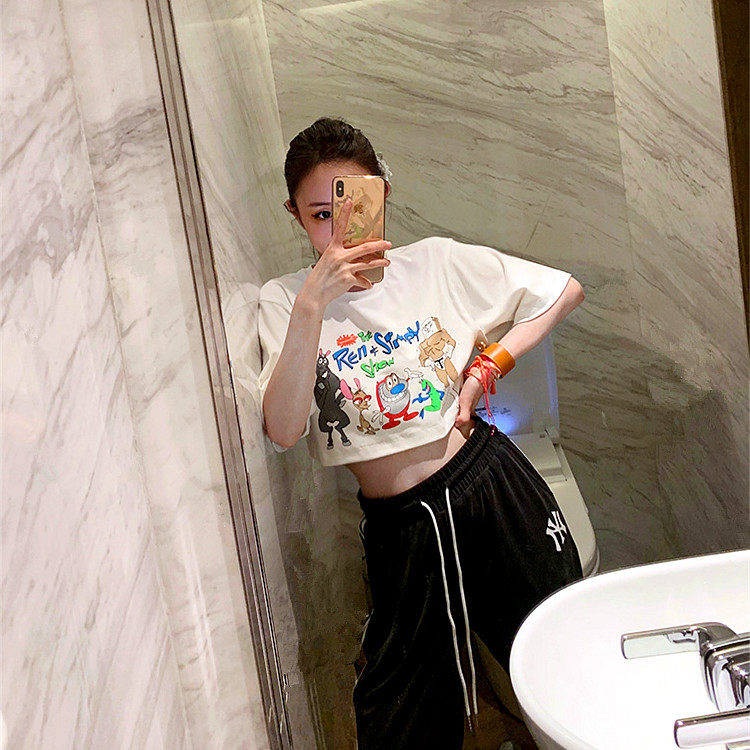 Korean Cartoon Loose short Dew Navel Short Sleeve Hooded Sport Fitness Goddess Casual Running Pure Cotton T-shirt