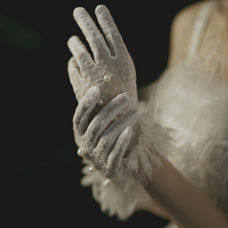 Bridal Korean style white lace flowers light gauze gloves elegant Hepburn wedding dress wedding dress photo studio short pearl
