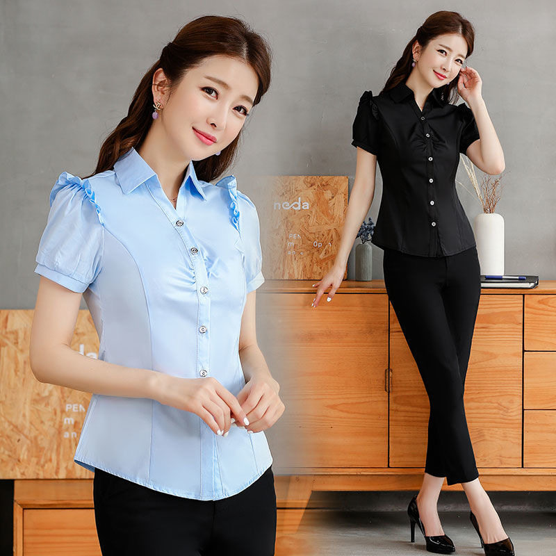 Small white shirt female short-sleeved summer V-neck professional shirt slim fit tooling interview work overalls female