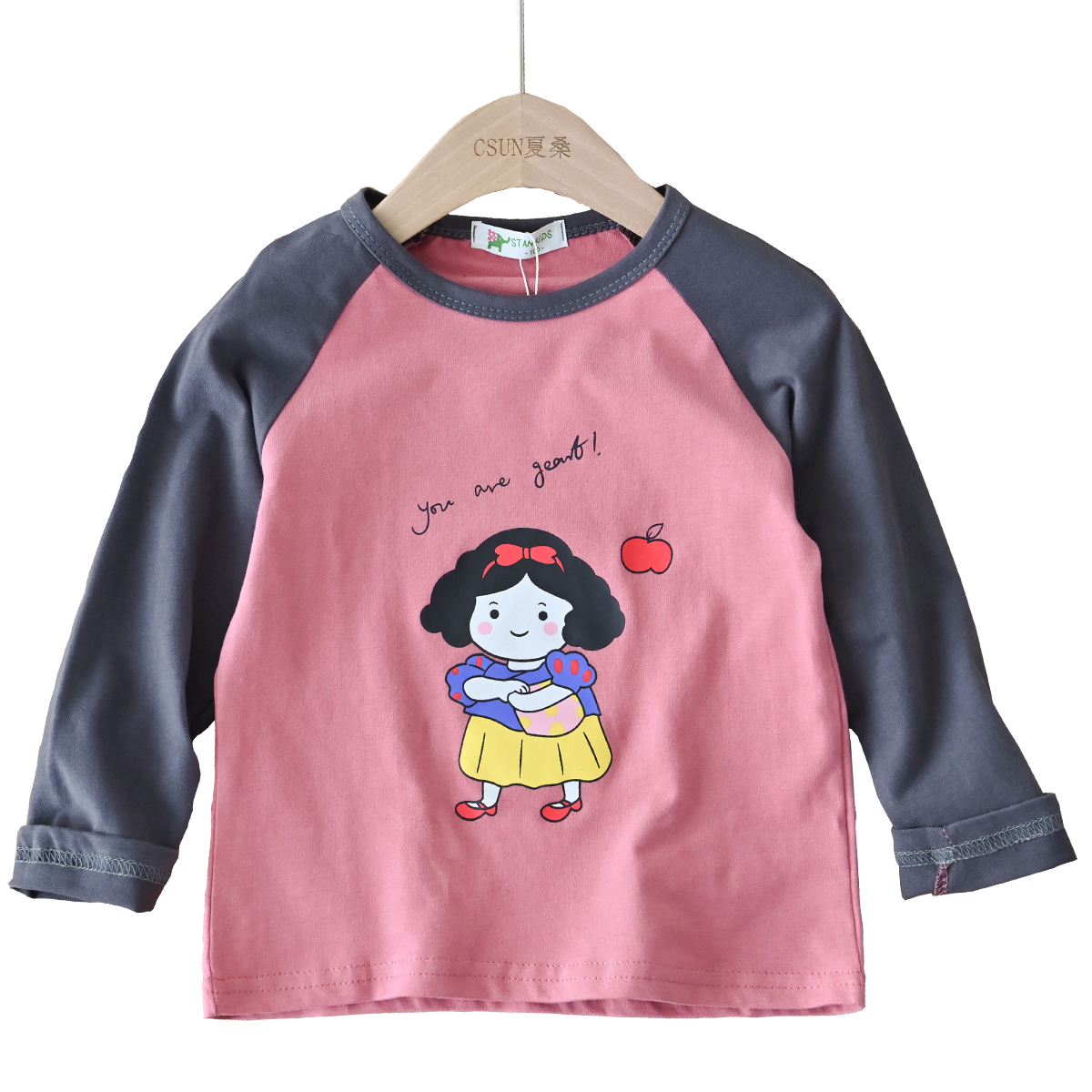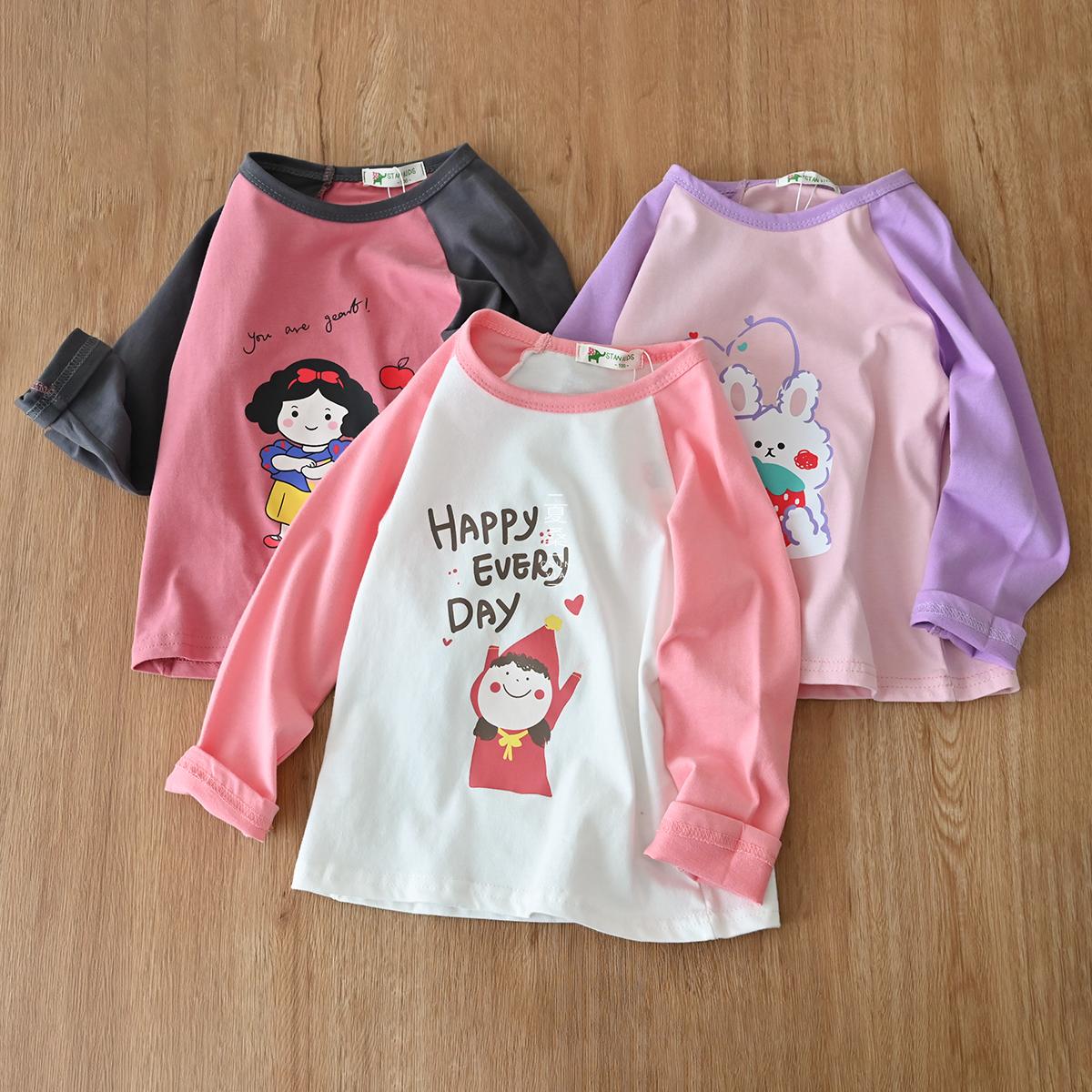 Little girls will like childlike cute raglan sleeve T-shirt for girls) Cotton loose crew neck long-sleeved top