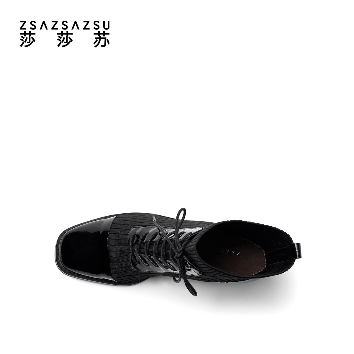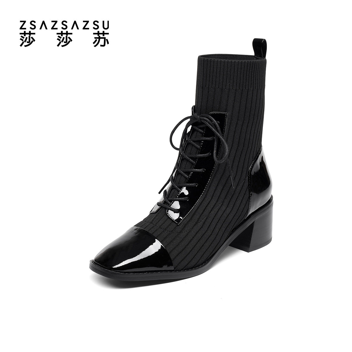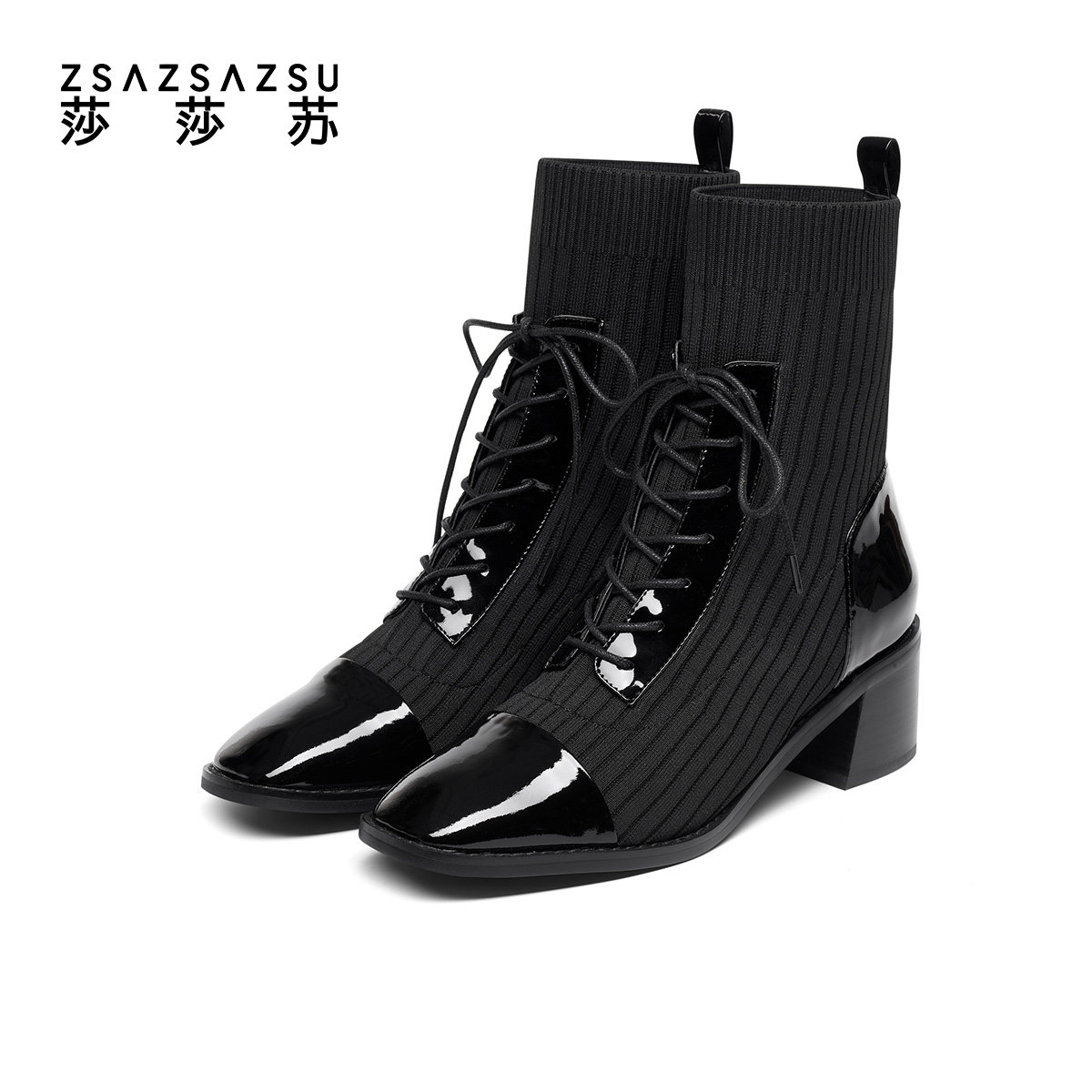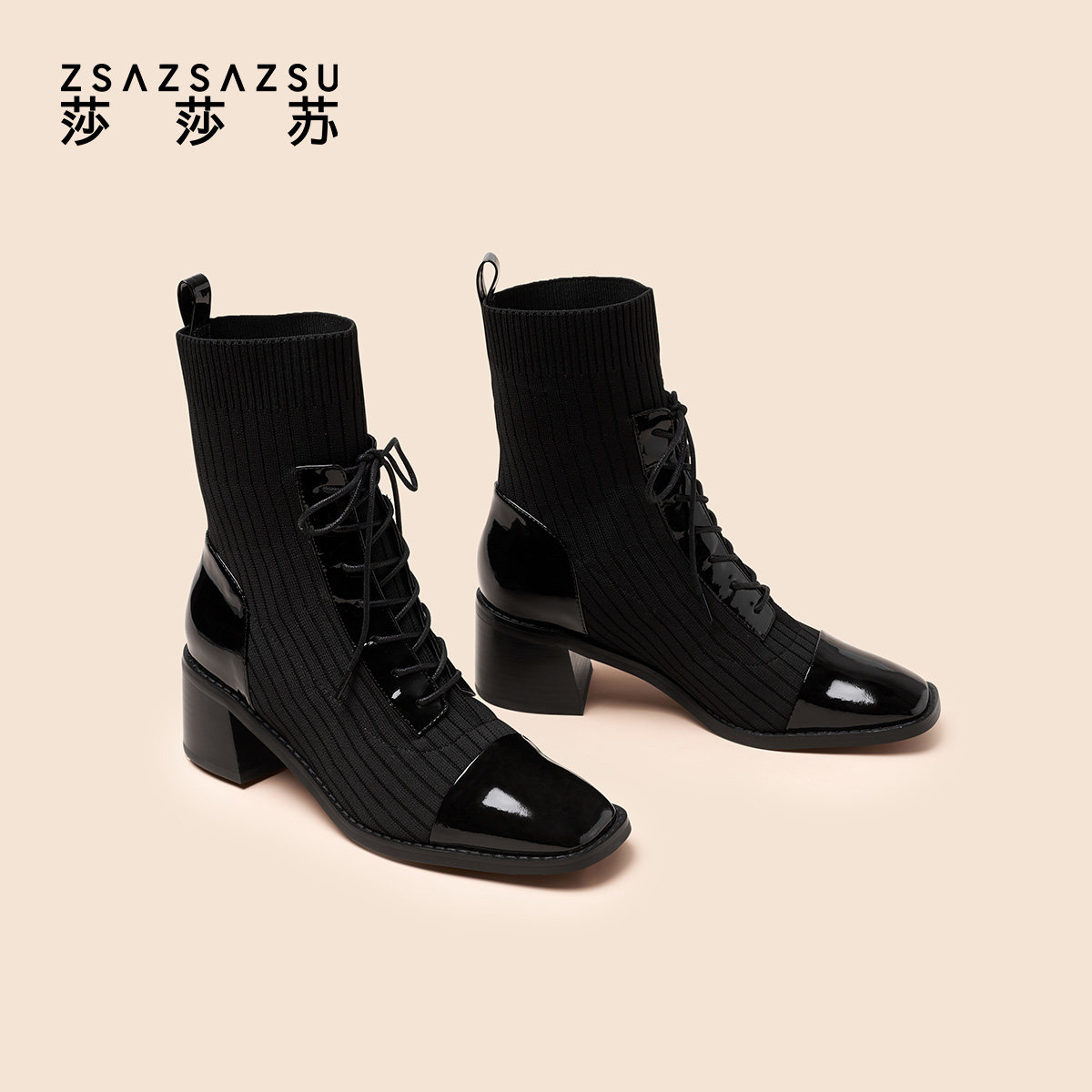 Sasha Su autumn Joker thick black French boots women's fashion lace-up square head short boots with thin socks boots