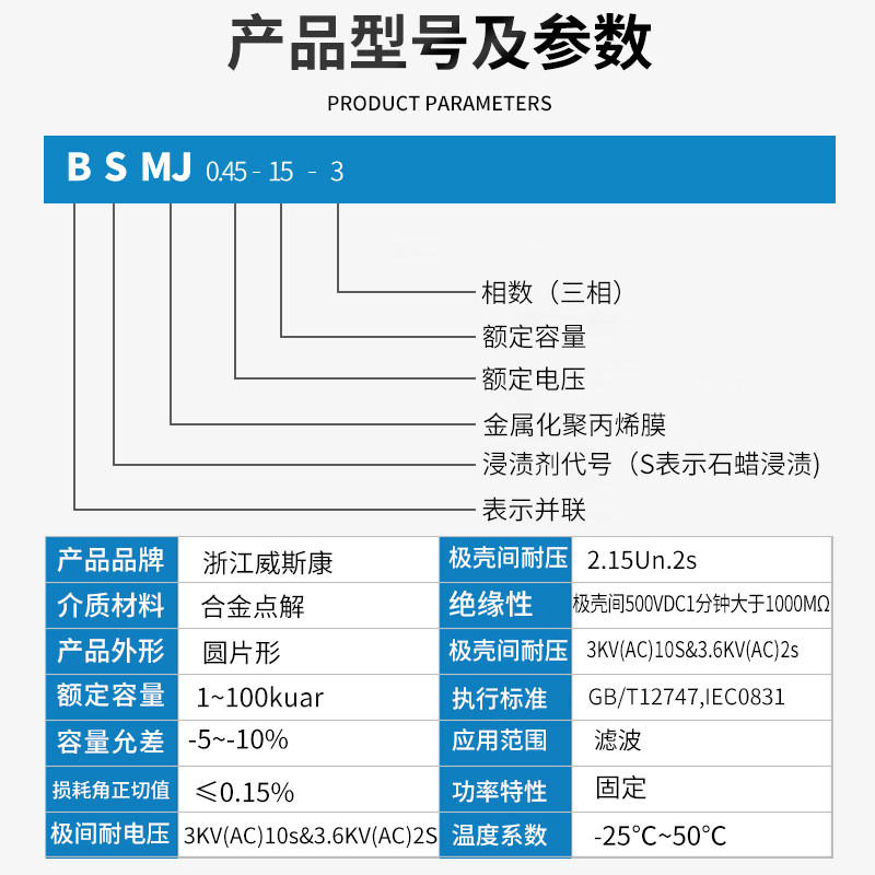 Zhejiang Weston Power Capacitor BSMJ0 48 Series Self-Healing Three-Phase Compensated Parallel Power Capacitor