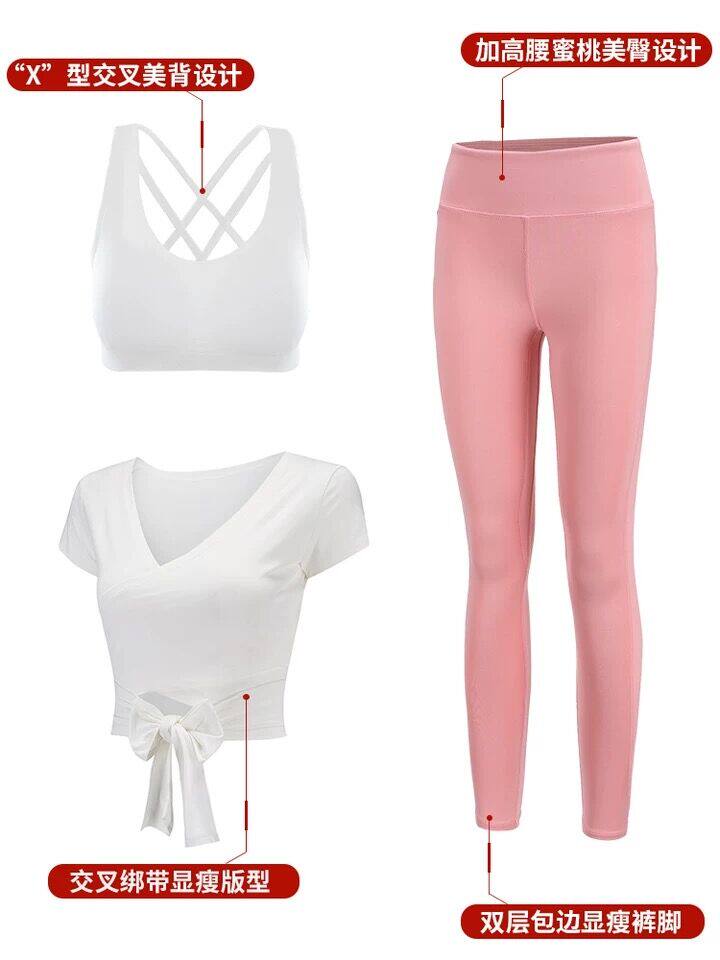 White top, black trousers, white top, pink trousers, black top, black trousers, white top, white bra, black trousers, white top, white bra, pink trousers, black top, black text