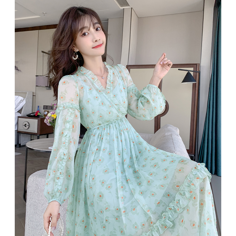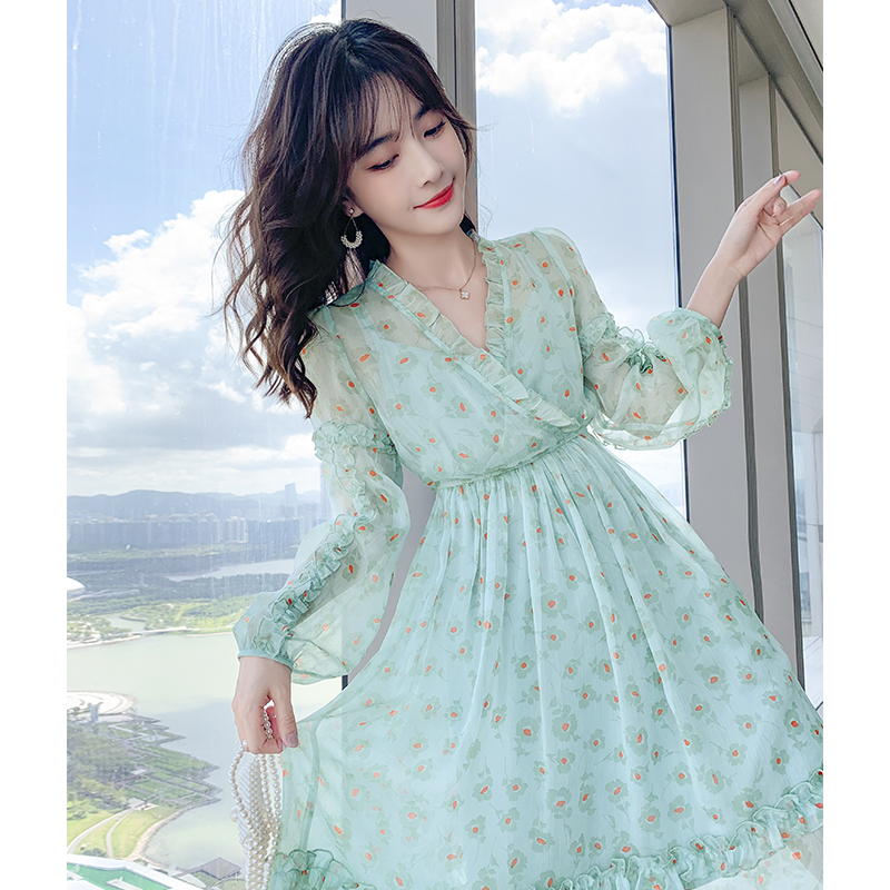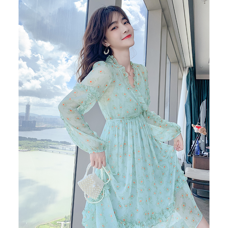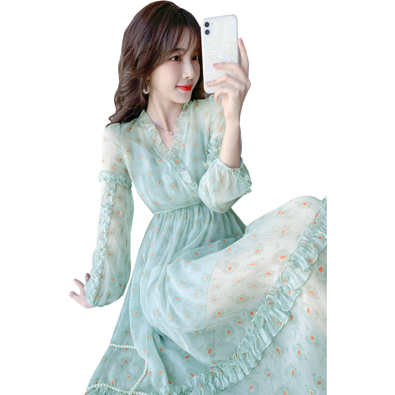 Fan-style small crowdsourced green fragrants snowspun foreign dress female V collar long dress Slim Fit Fairy's Fairy Skirt Superfairy
