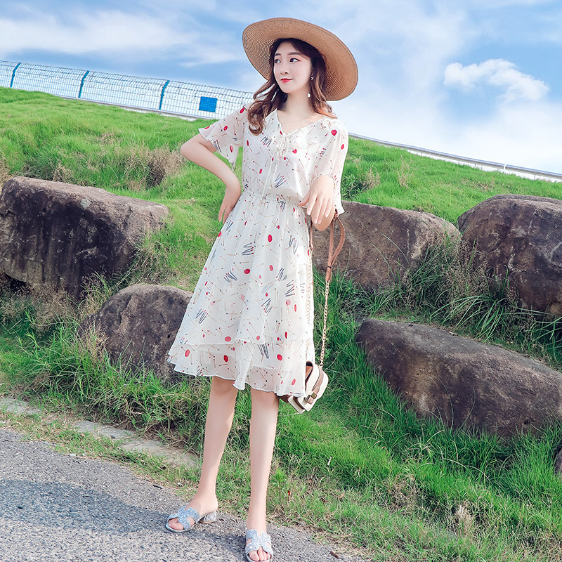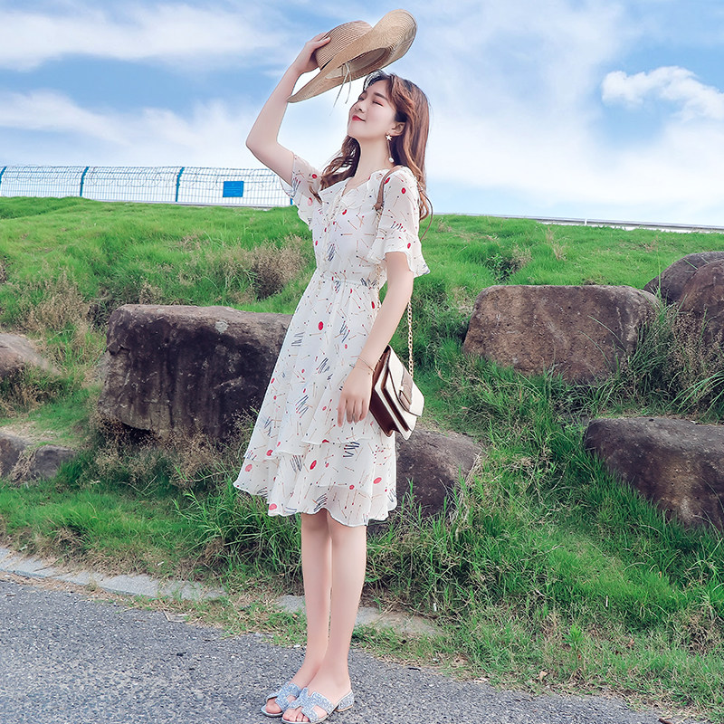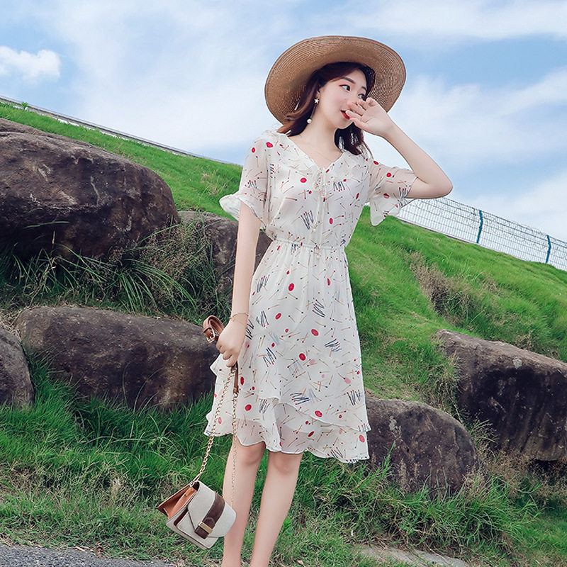 Floral dress women 2022 summer new small Korean style slim waist and trumpet sleeves small fresh chiffon skirt