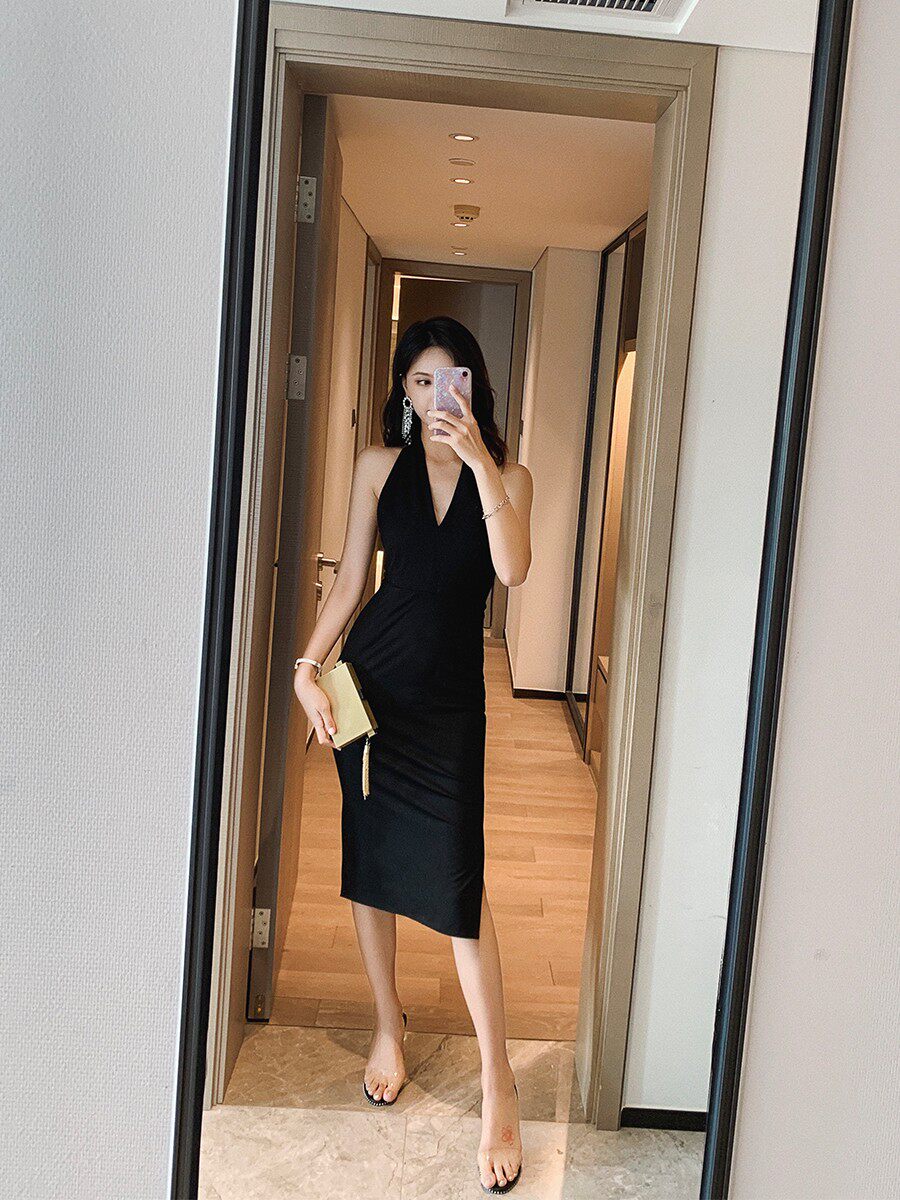 Ye Xiaoxian Sexy V-neck black hanging neck slit mid-length backless party banquet temperament evening dress dress