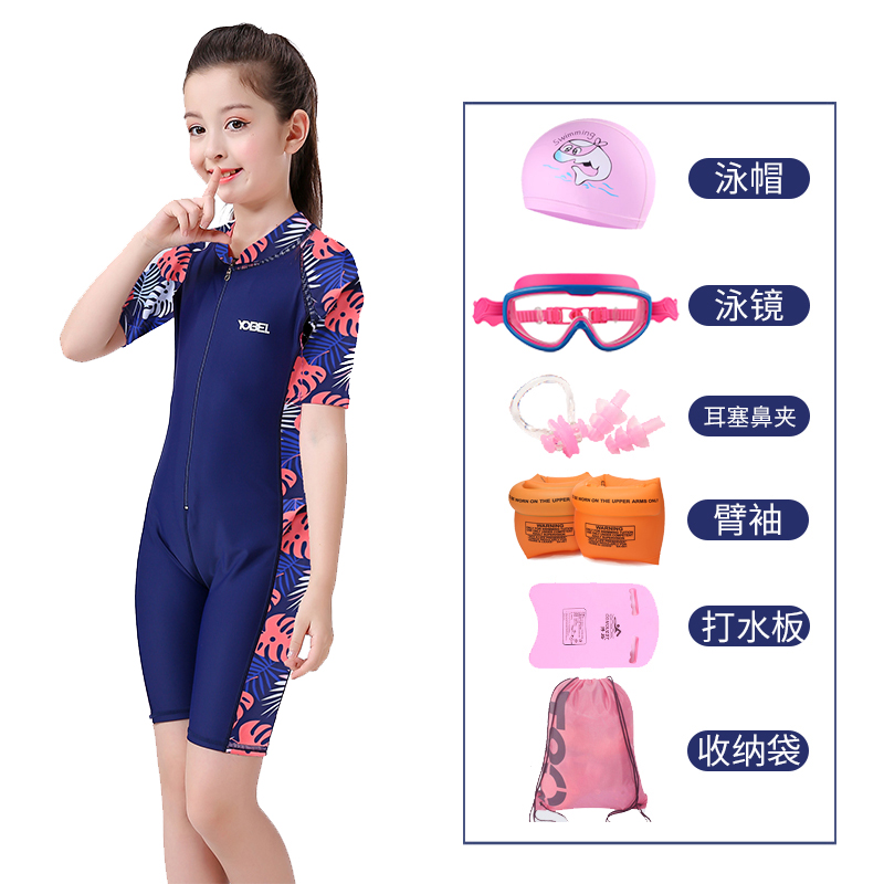 Short-sleeved swimsuit Dark blue powder(send swimming cap) Navy blue leaf swimsuit(send swimming cap) Long-sleeved swimsuit(send swimming cap) Short-sleeved swimsuit Sunscreen cap Navy blue leaf swimsuit Swimming cap Goggles Navy blue tree