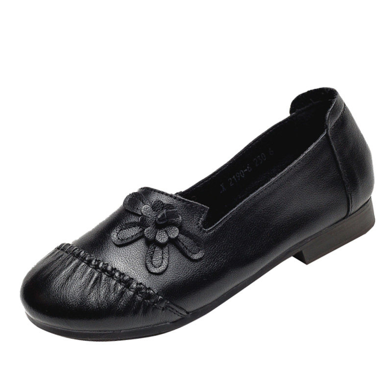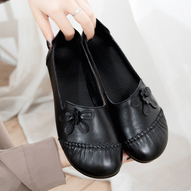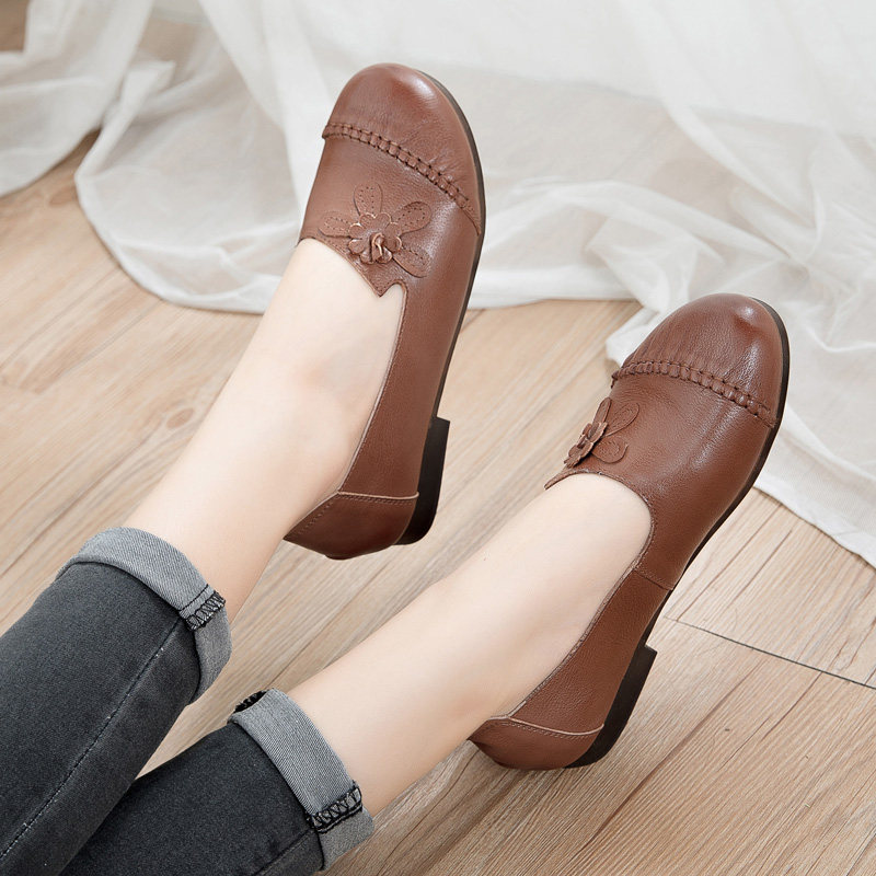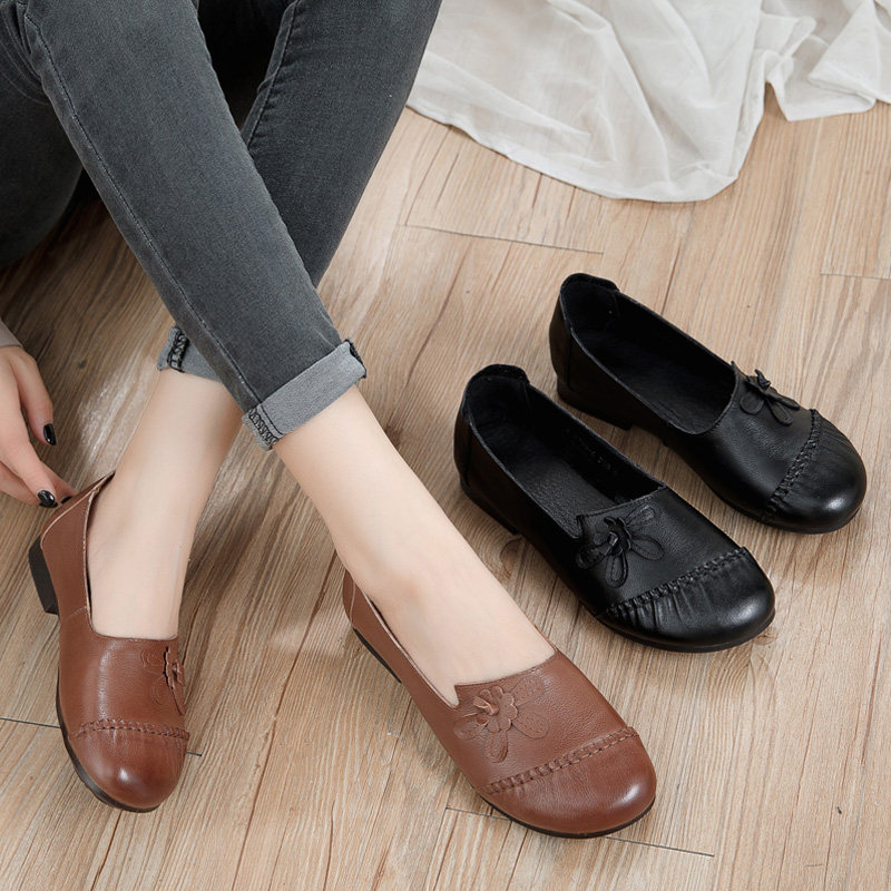 20 Fall New Genuine Leather Mom Shoes Non-slip Soft Bottom National Wind Casual Women's Shoes Round Head Flat Heel Middle Aged Single Shoes