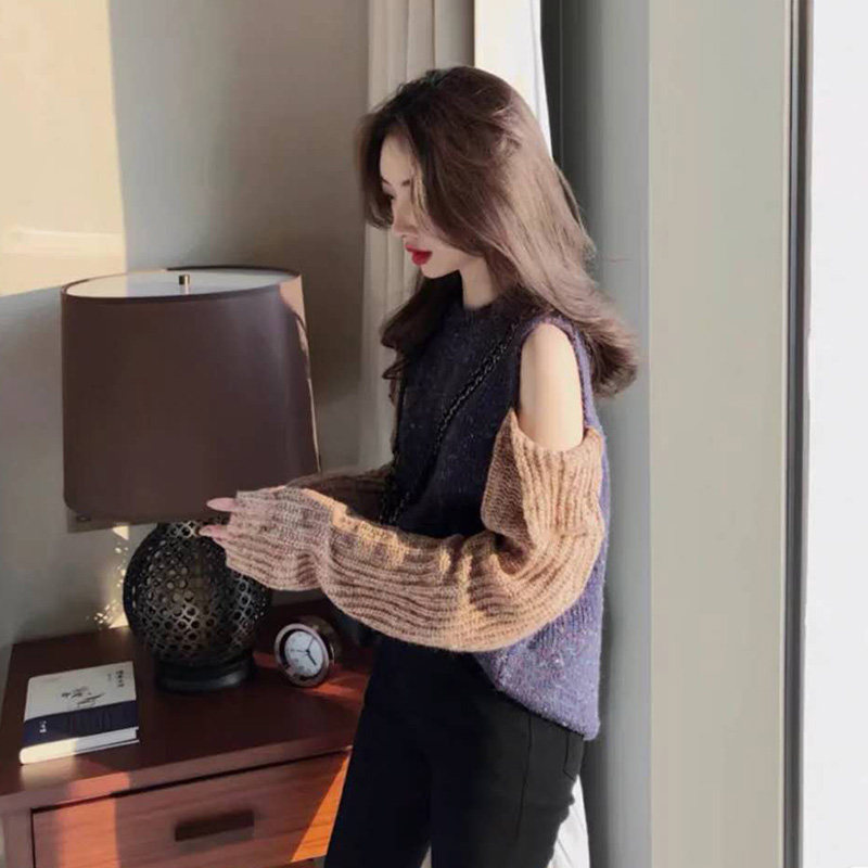 Off-the-shoulder sweater women's 2023 early spring new trendy lazy style pullover hit color loose sexy temperament knitted top