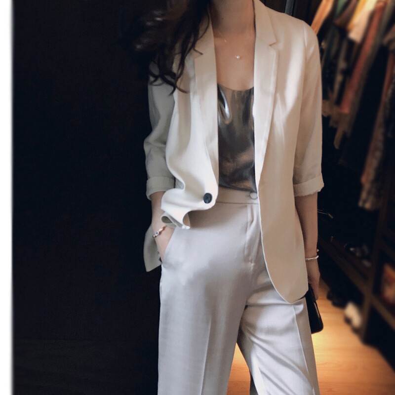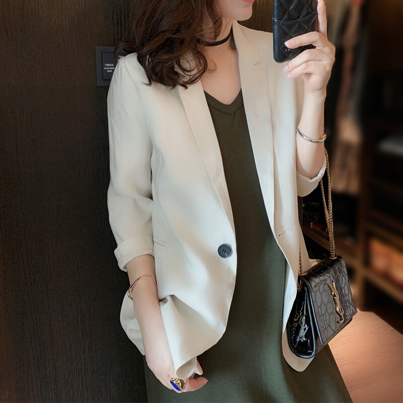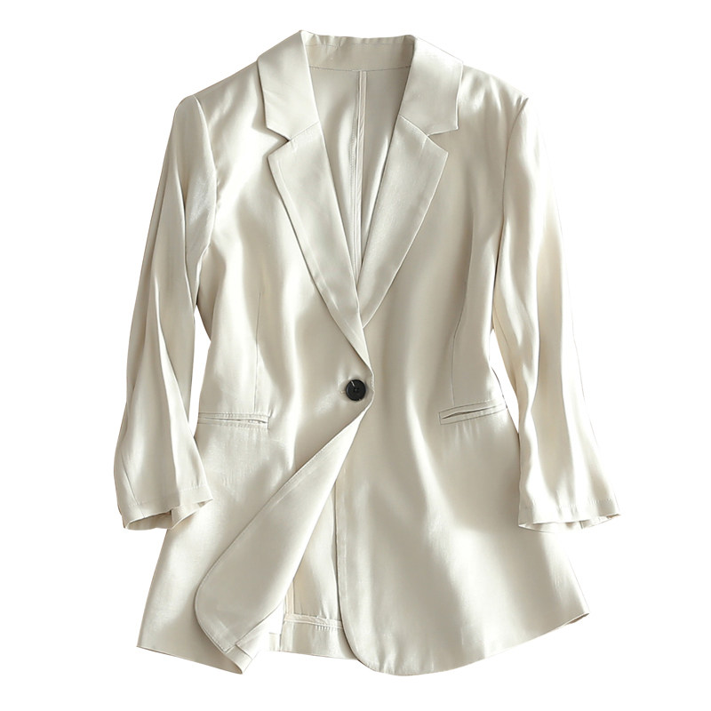 Thin drape suit jacket women's 2021 new casual tri-acetic acid pearl satin three-quarter sleeve small suit top