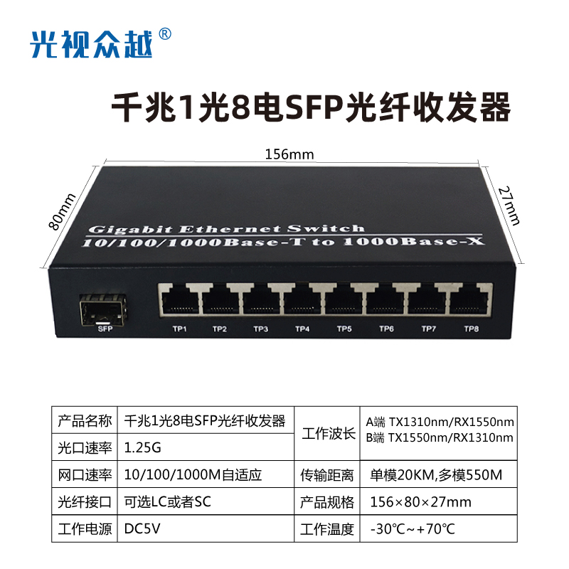 Gigabit 1 optical 8 electrical SFP fiber transceiver single-mode multi-mode single-fiber photoelectric converter LC or SC port with module
