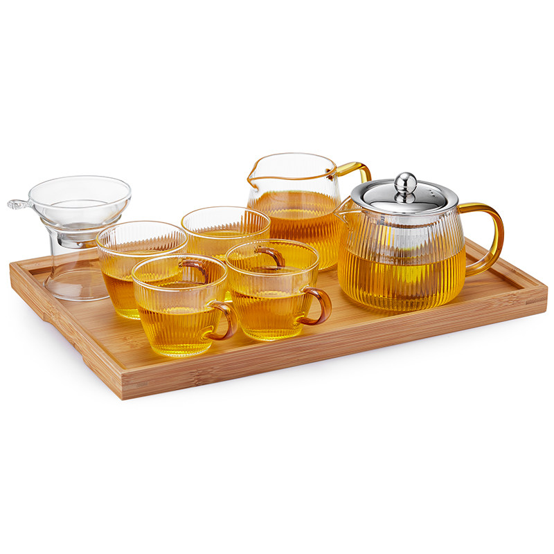 1 pot, 1 male cup, 4 small cups, 1 tea tray (set of 7), 1 pot, 1 male cup, 1 strainer, 4 small cups, 1 tea tray (set of 8)