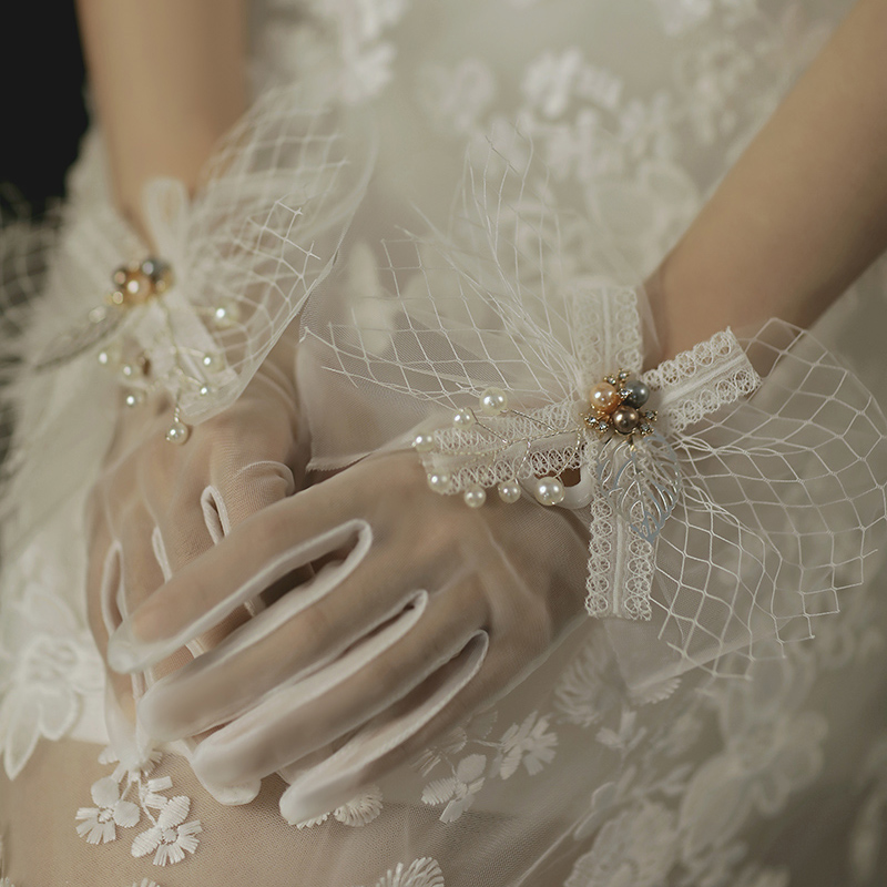 New Sensin Bride Wedding Dresses Handmade Pearl String Pearl Dress Photo Translucent Sheet Short Yards Gloves