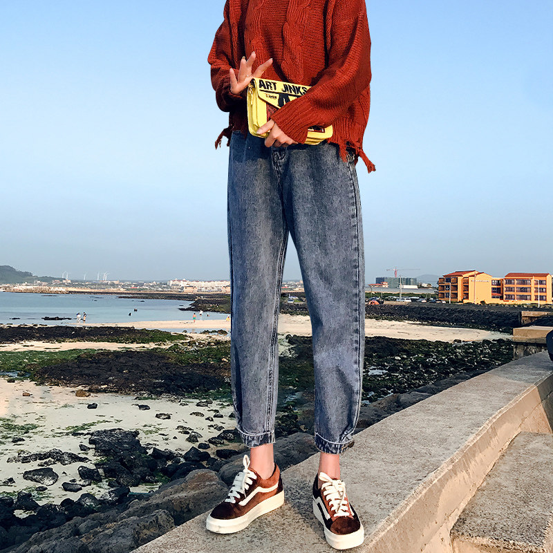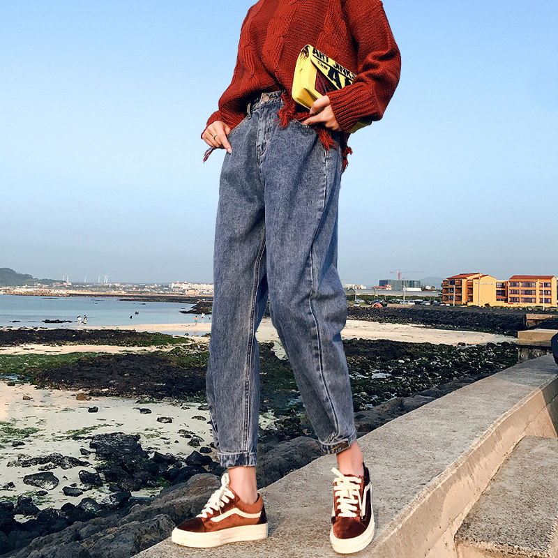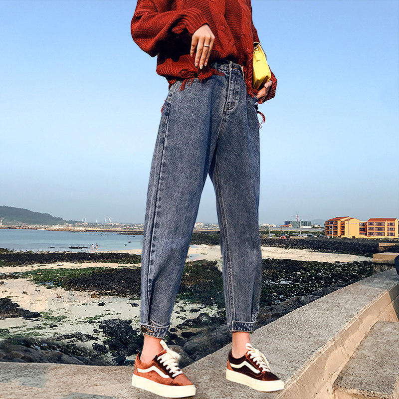 Jeans female trousers autumn new high waist loose show thin big fat MM nine points pants father radish halun pants