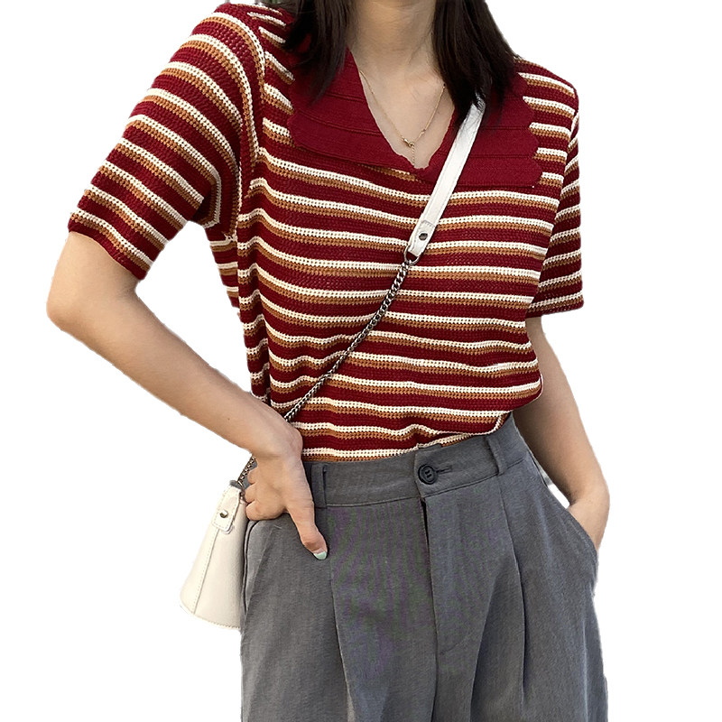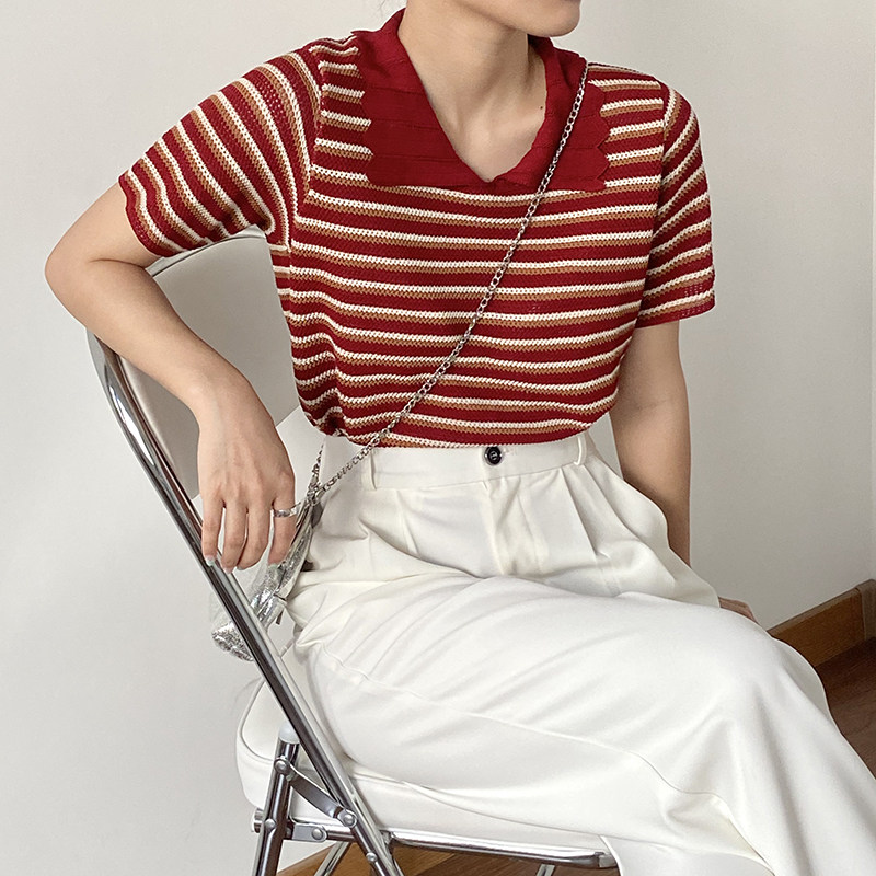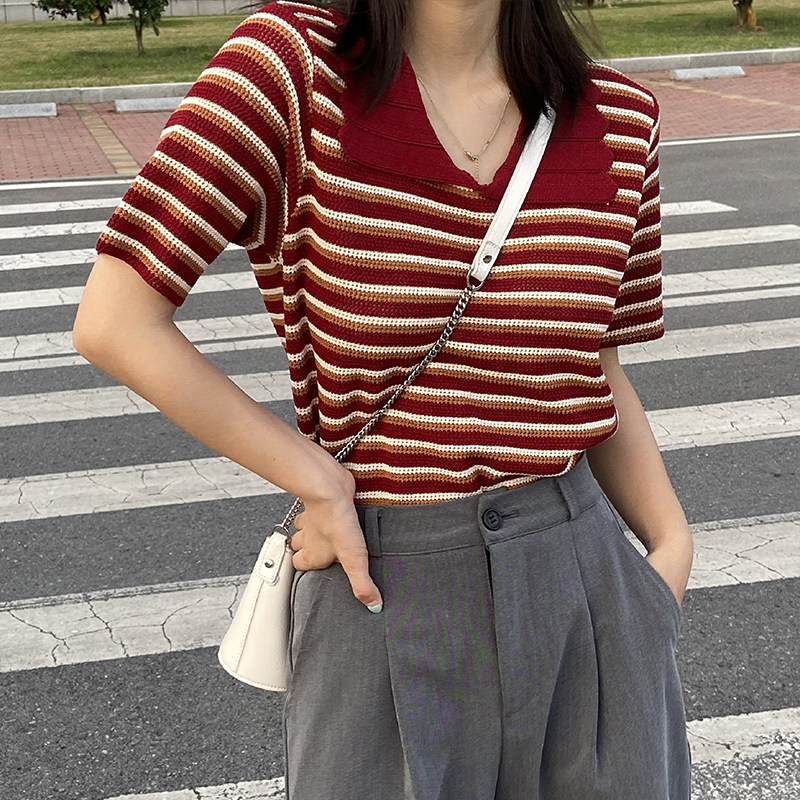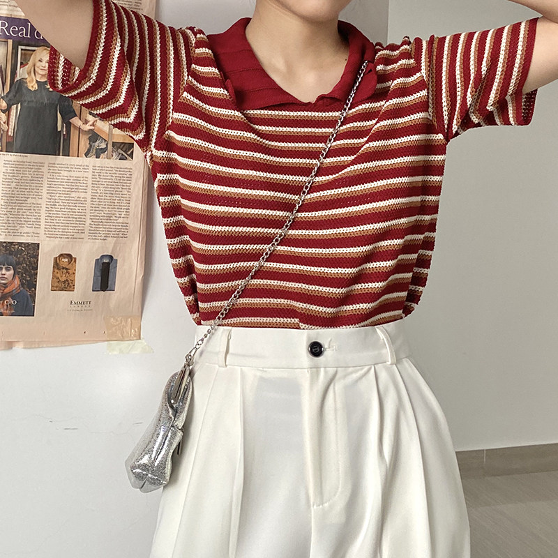 HUILIULIU sweet retro style striped POLO shirt women's summer Hong Kong style short-sleeved knitted sweater T-shirt cute lapel