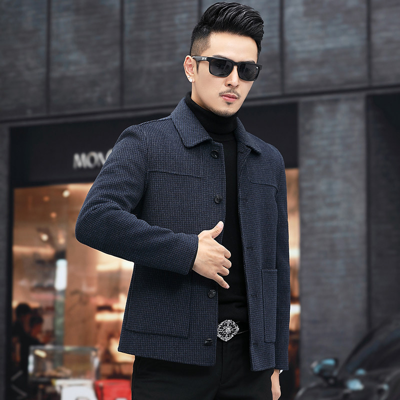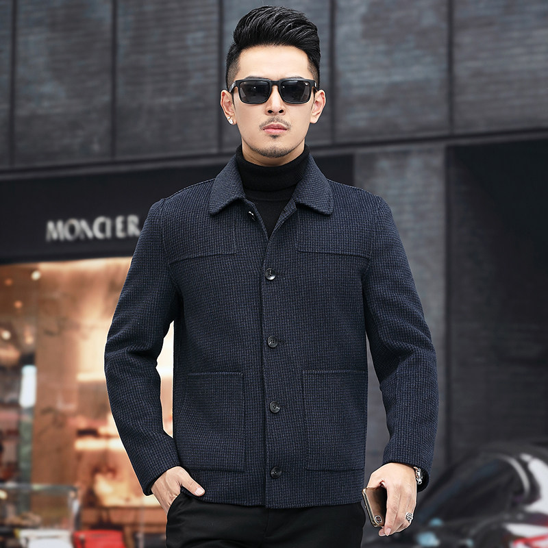 2021 new wool coat men's double-sided wool short section autumn and winter lapel without cashmere plaid middle-aged coat