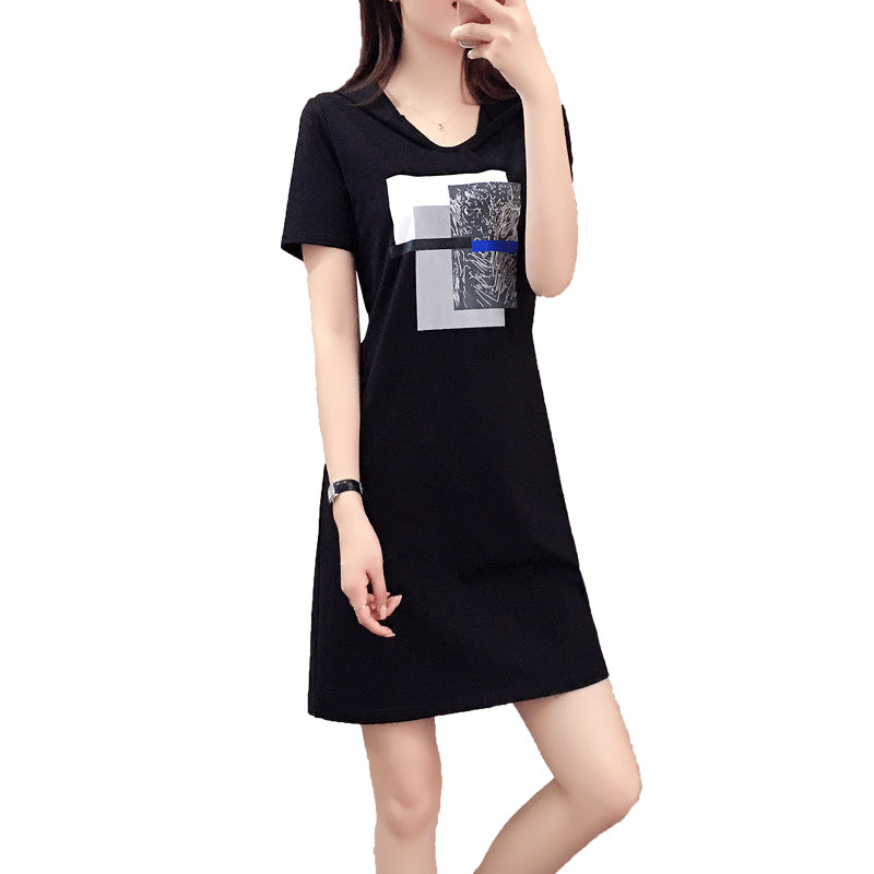Tide brand 2021 summer women's short-sleeved Korean version round neck hooded sports mid-length T-shirt skirt casual dress women