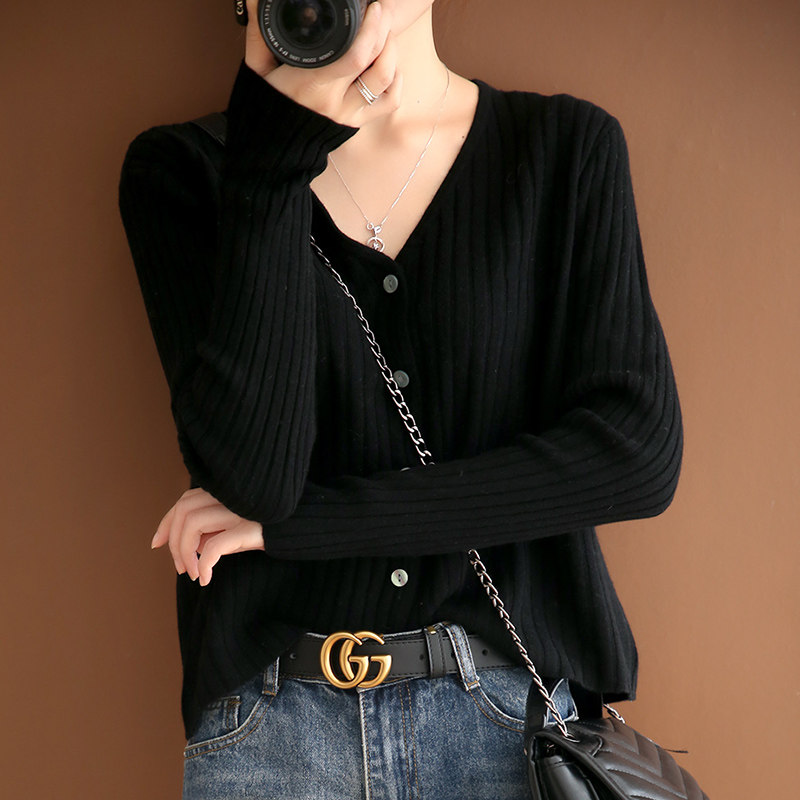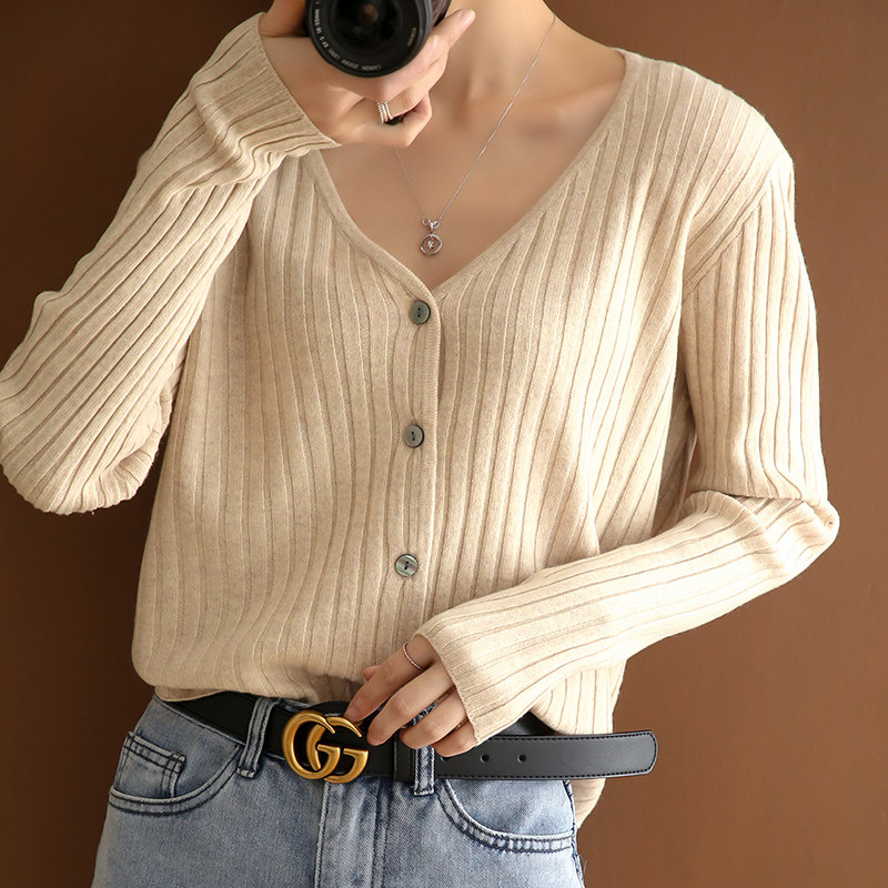 Pit strip knitted cardigan women's 100% pure wool 2021 spring new V-neck loose short sweater coat base
