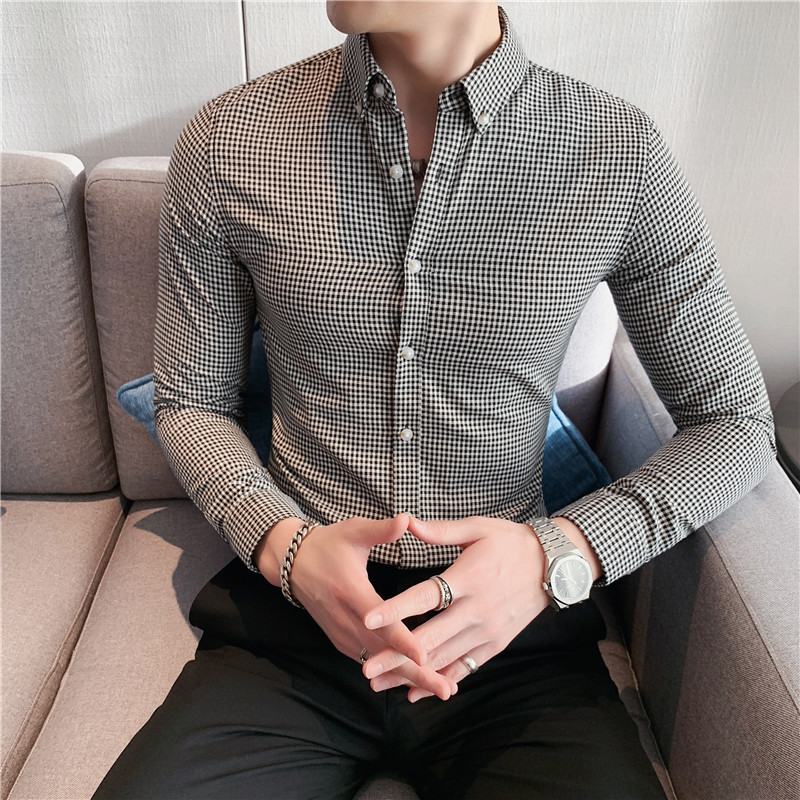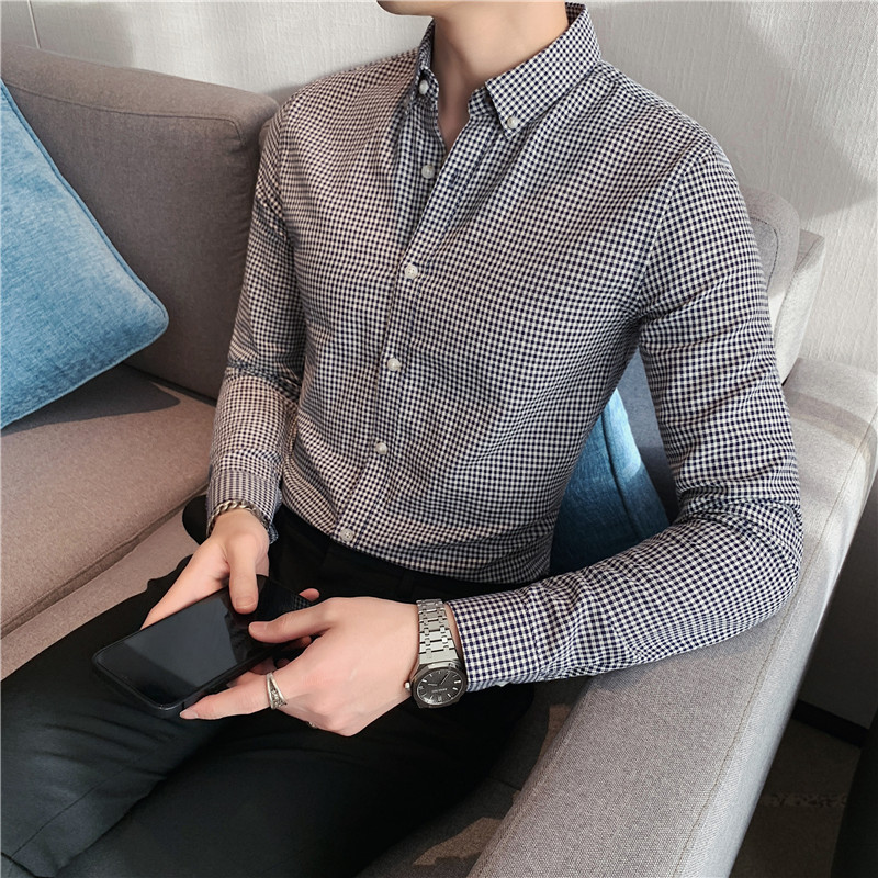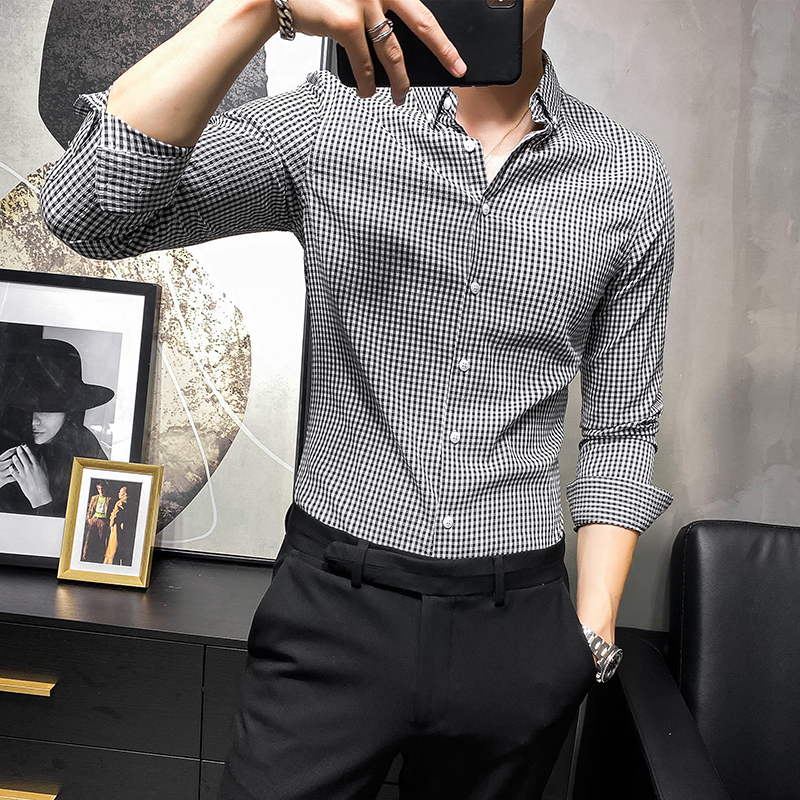 Spring swing bird lattice shirt men's long-sleeved Korean version of the trend fashion men's body-fitting shirt casual handsome tide brand clothes