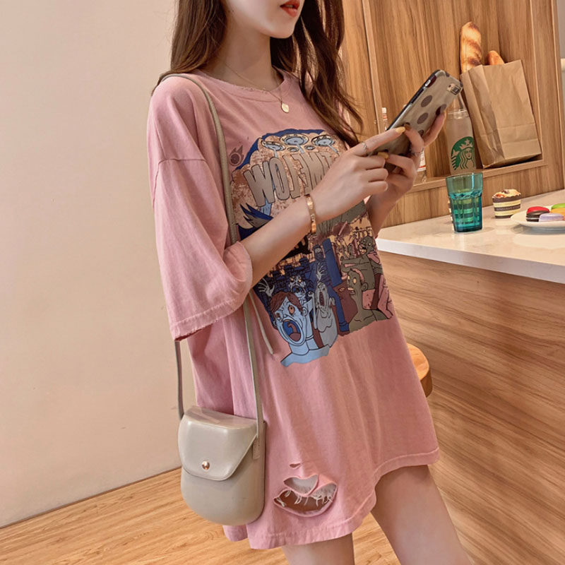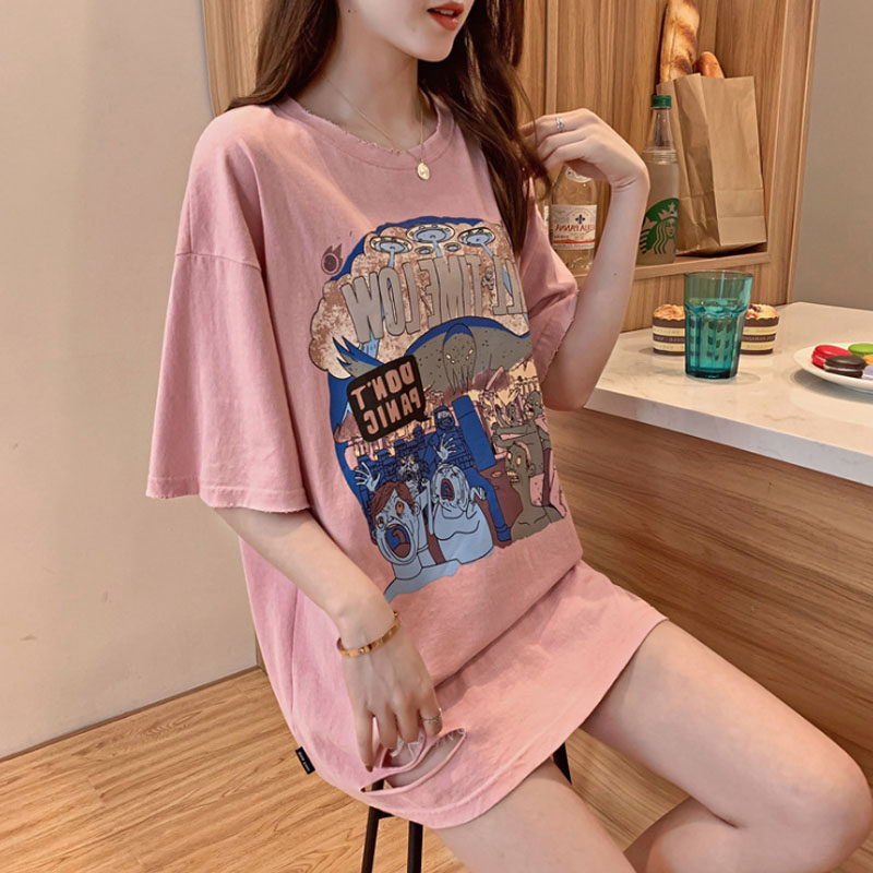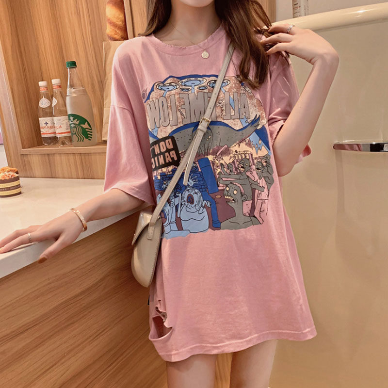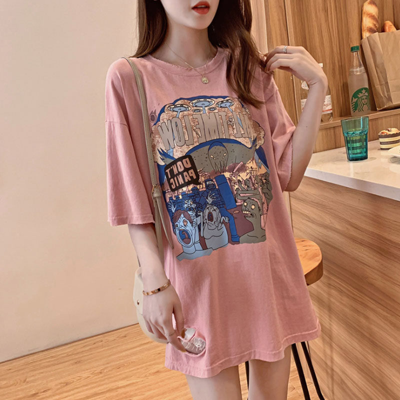 Eurostock Large version New section Disappearing Short Sleeve T-Shirt Woman Ins Overfire Harbor Wind Loose 100 Lapped Printed Half Sleeve Blouse