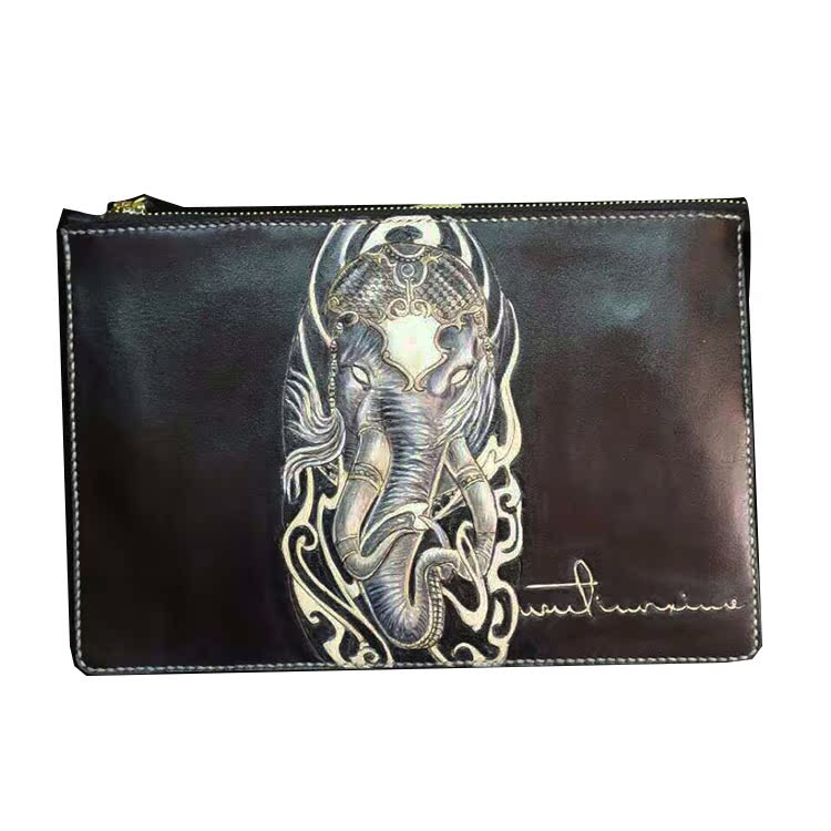 Handmade leather engraved envelope leather casual men's and women's leather national style zipper clutch retro elephant god briefcase