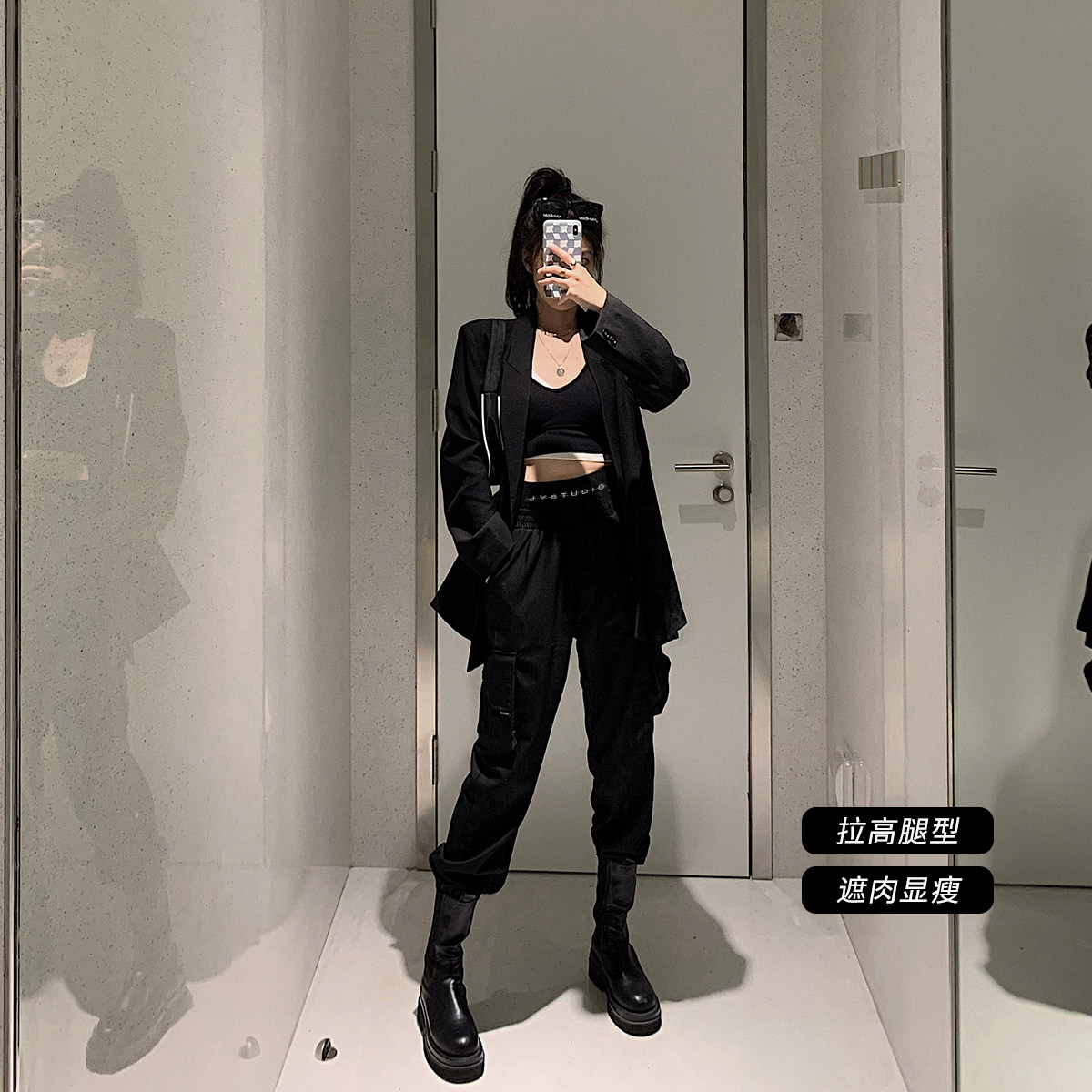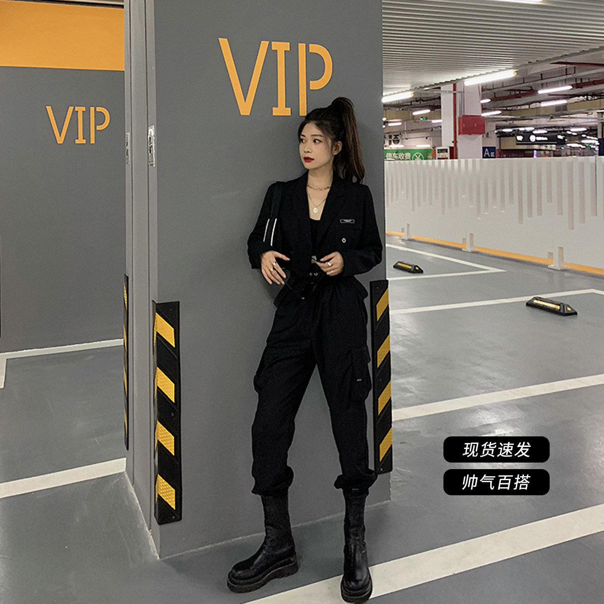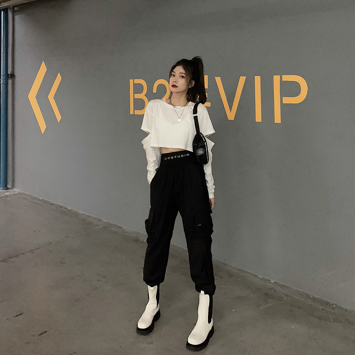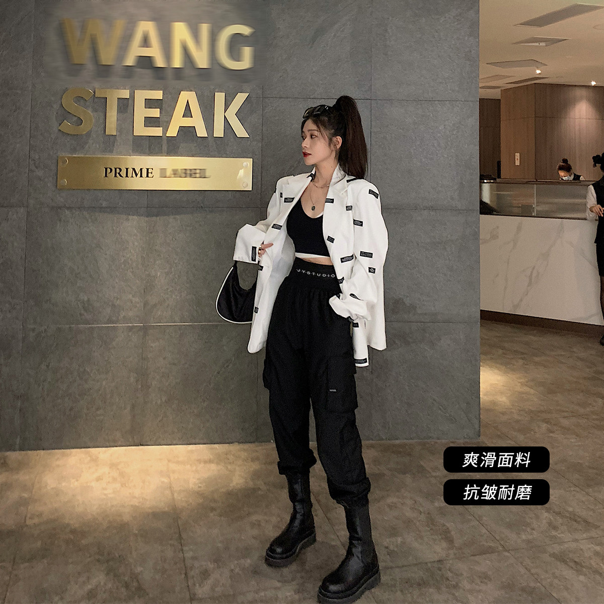 Jing Ye overalls women high waist thin loose bf tide handsome straight casual spring and autumn letter waist nine-point bundle leg pants