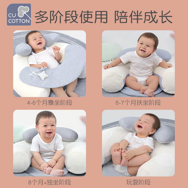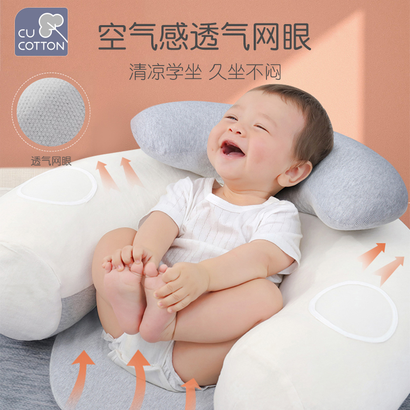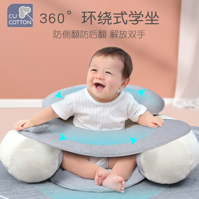 Cute cotton baby sitting on an artifact to practice sitting on a pillar anti-fall training seat