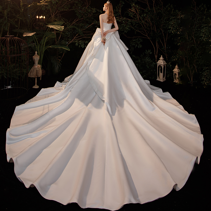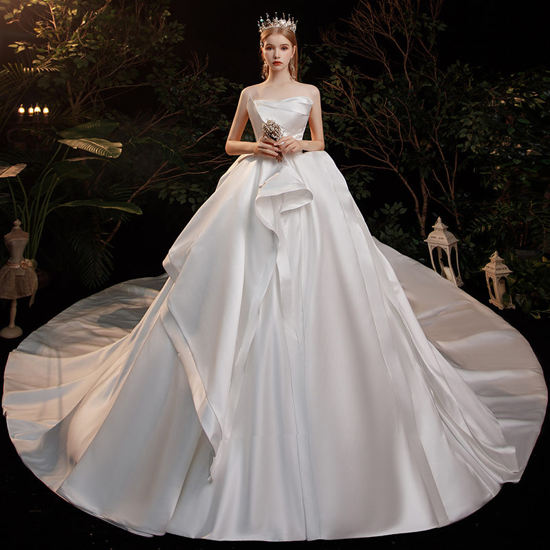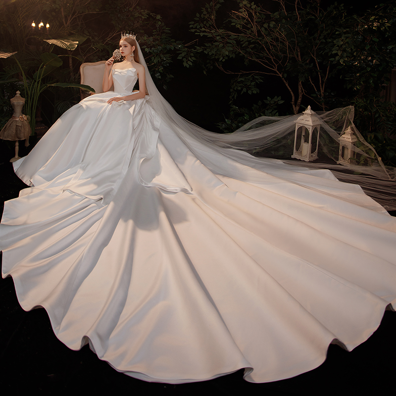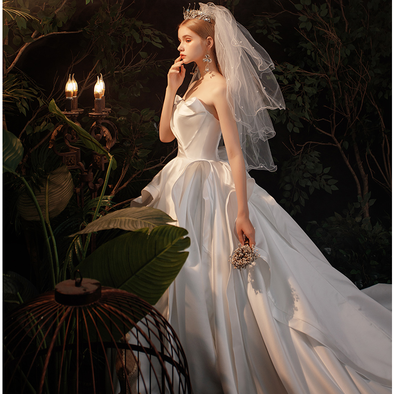 Satin main wedding dress 2021 new temperament bride small man light 2020 vintage go out yarn trailing bandeau