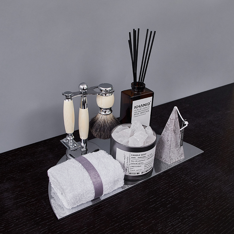 Bathroom set 0049 high-grade badger hair manual knife holder shaving set essential oil air fragrance volcanic rock white crystal stone earth rattan aromatherapy stainless steel silver semi-circular tray blue wind chime gray pointed candle white small