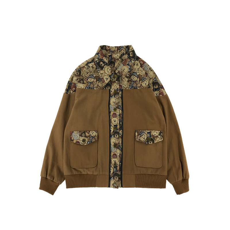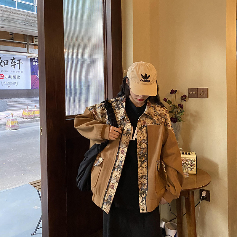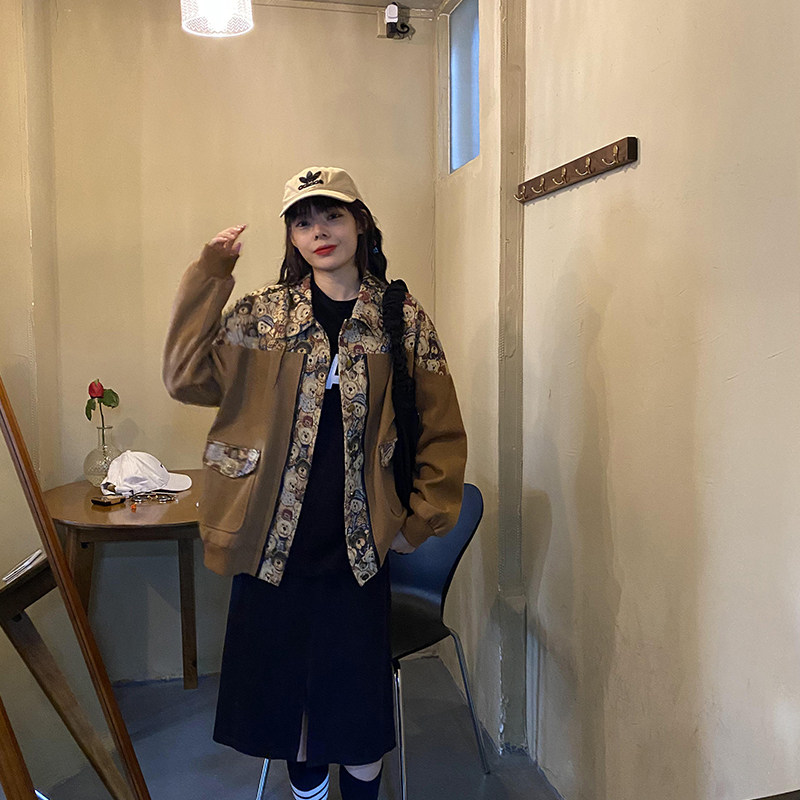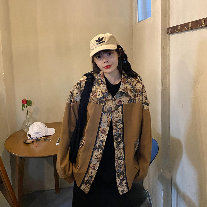 (Spot) Clear Barn Tooling Jacket Female Spring Autumn Loose Students Han Prints Chains Chains Chauded Short Spliced Retro Blouse-Taobao