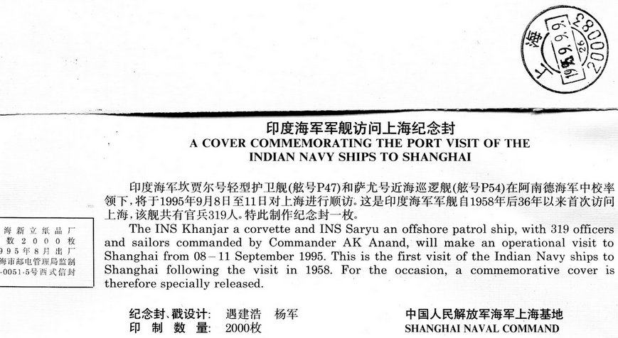 Commemorative cover of Indian Navy warships visiting Shanghai