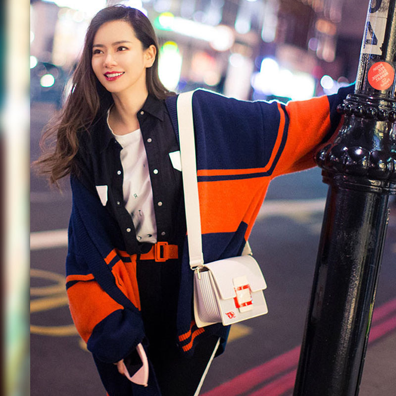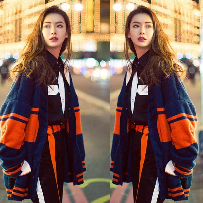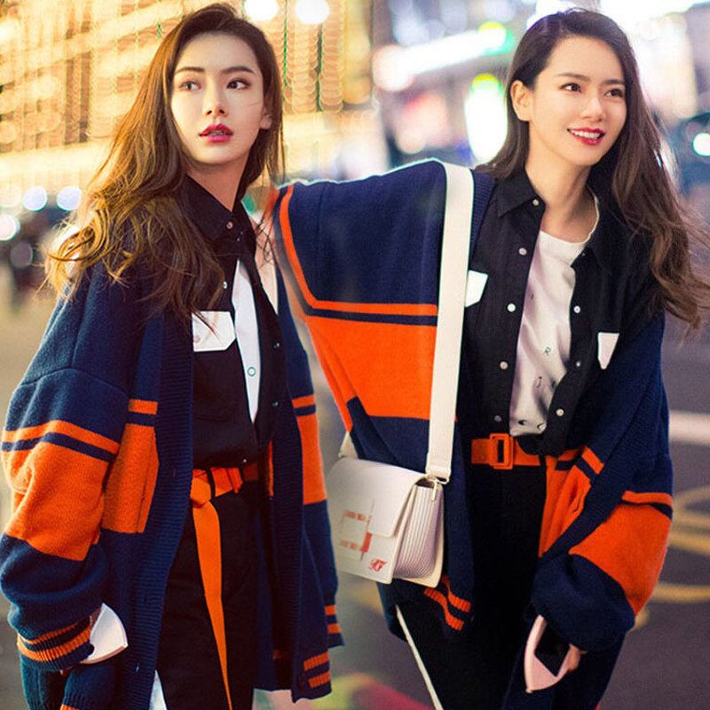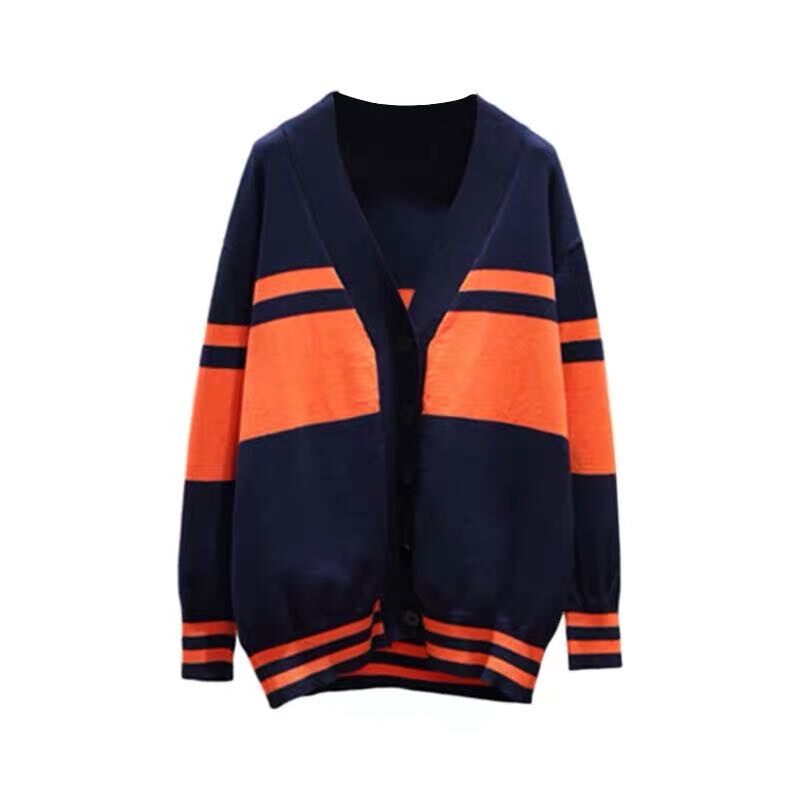 Qi Wei stars with the same paragraph 2022 Spring new sweater lady loose casual hit color V collar knit cardiovert jacket tide