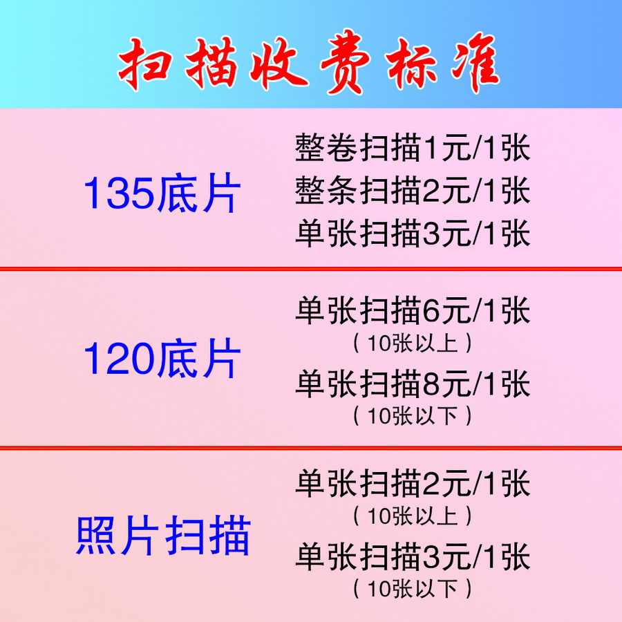 Photo scanning (more than 10) photo scanning (less than 10) film 120 (more than 10) film 120 (less than 10) film 130 (whole roll) film 130