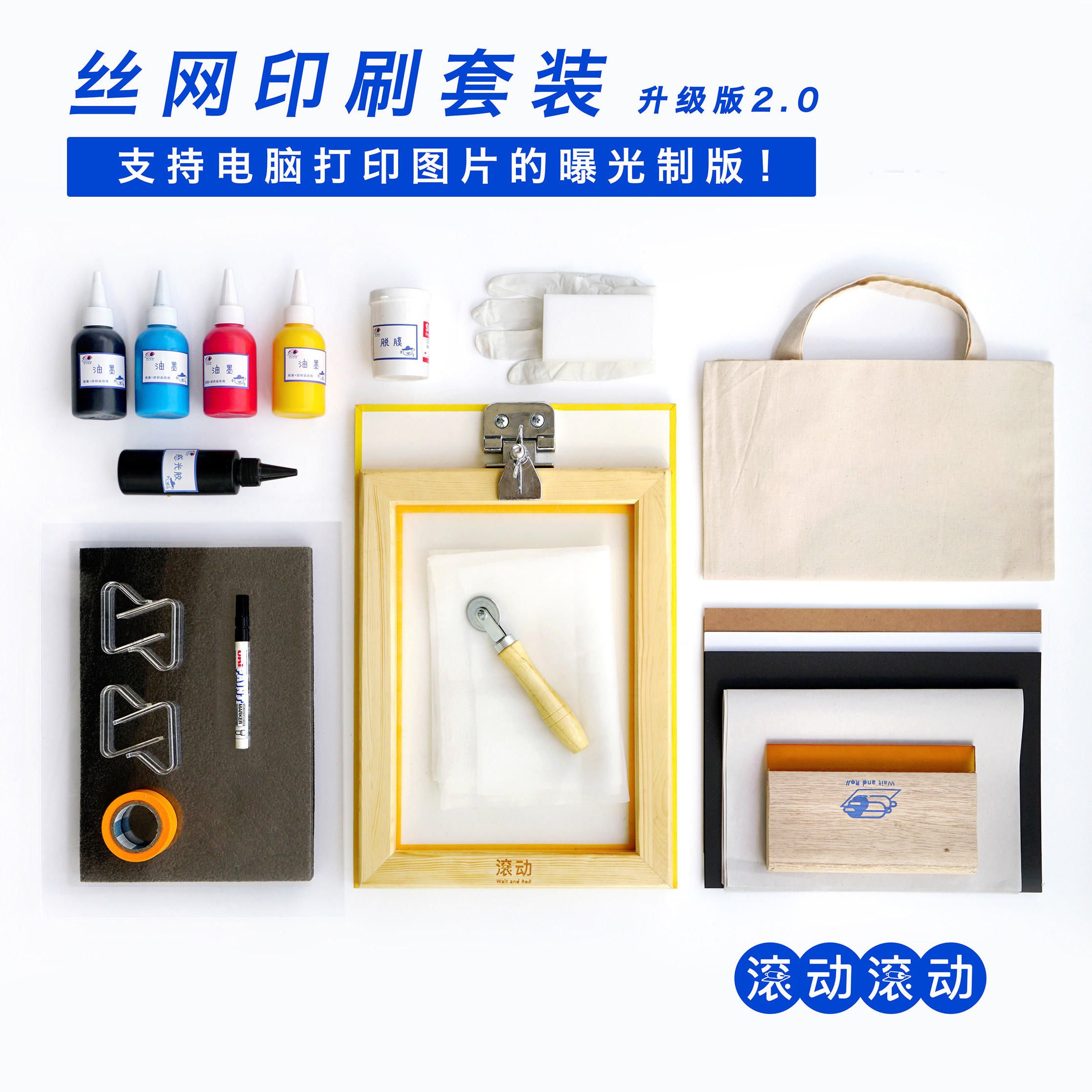 Upgraded edition Household screen printing set No lamp self-bandage screen plate 5 pieces of screen + bandage tool blank screen 3 pieces of 200 mesh reinforcement colorant Ink is not afraid of washing plus a ultraviolet light 8w Cloudy night drying plate Has a UV lamp plate Upgrade screen printing set! Blank film 5 sheets - laser printing exclusive