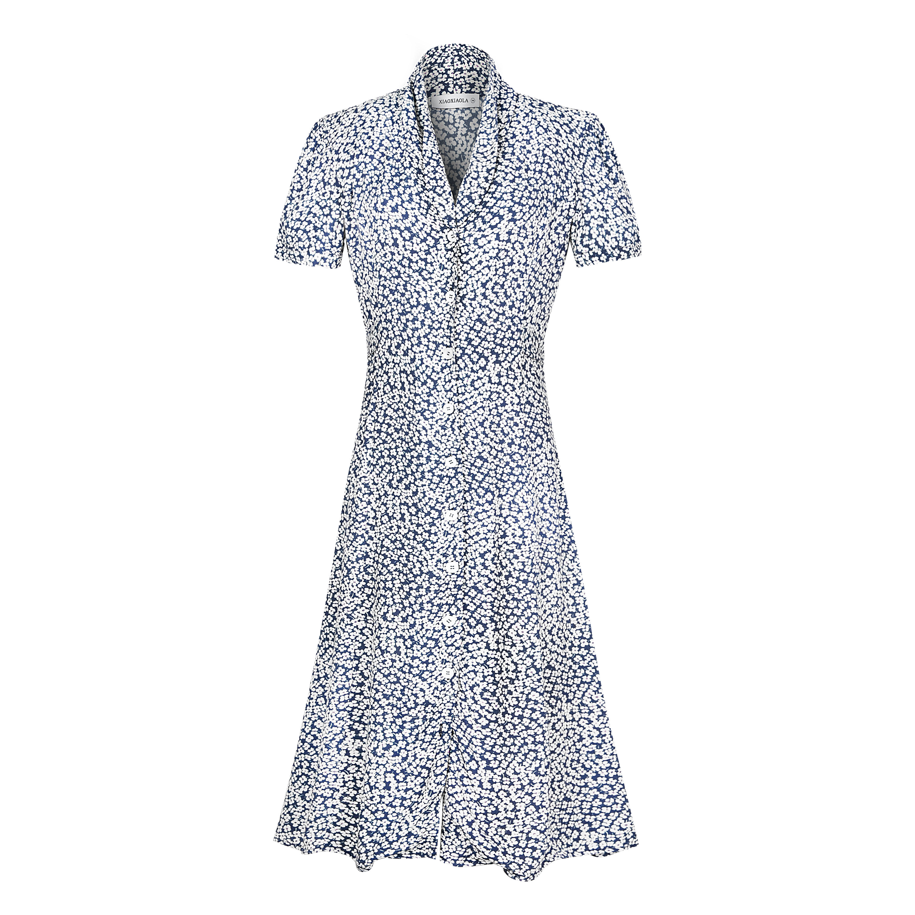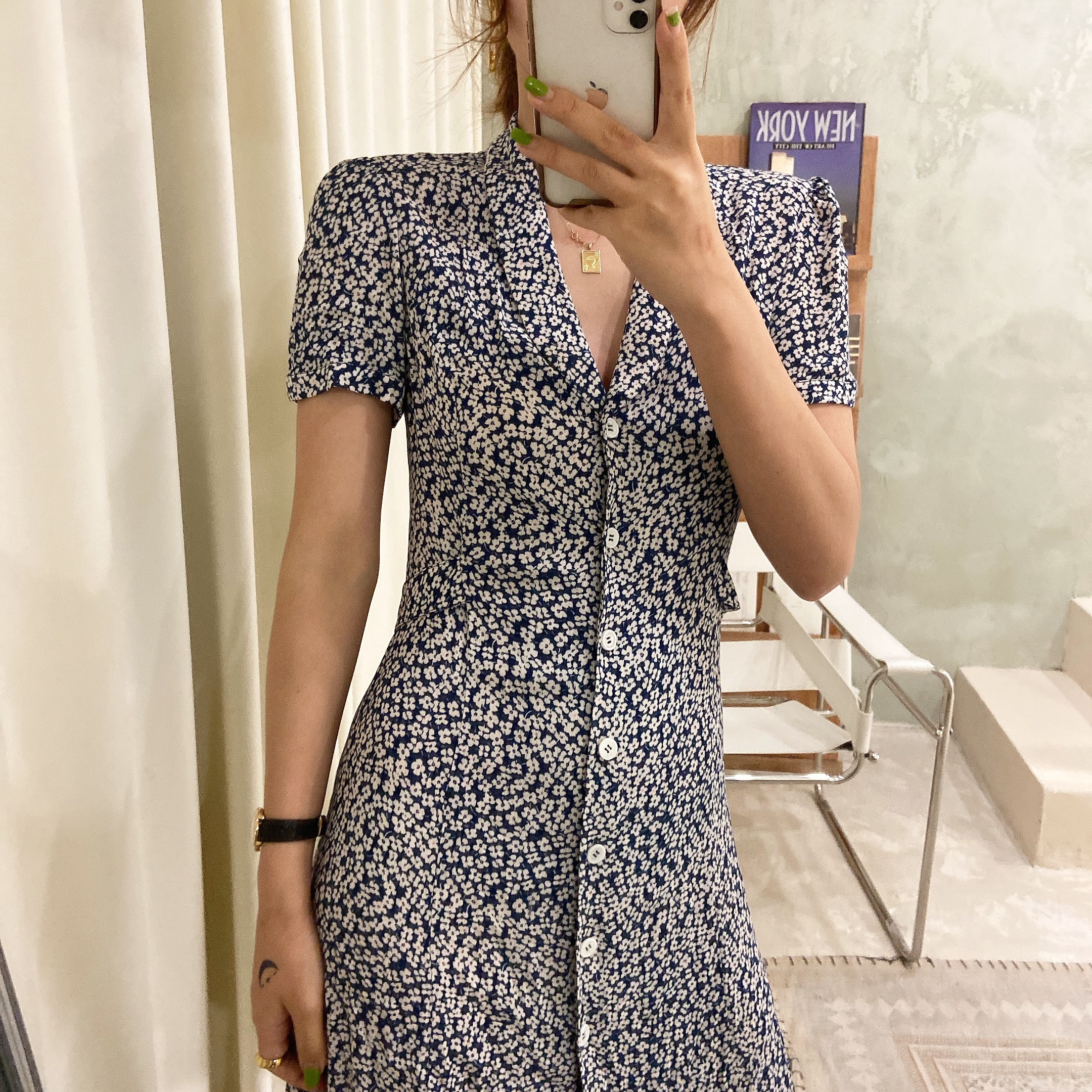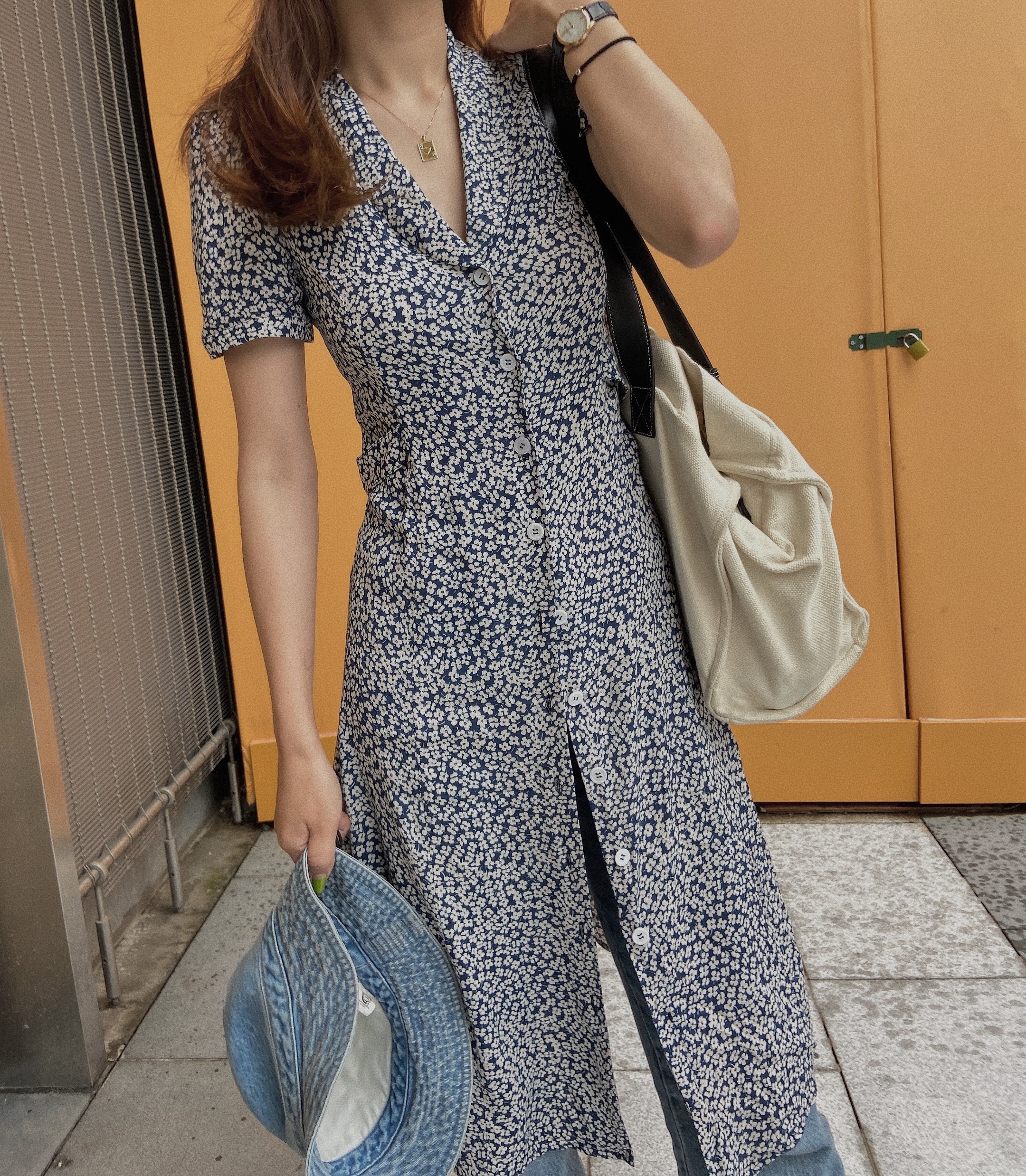 Small pull 1937 Summer French style small turn collar single row Buttoned With a floro-style silk sliding long dress to close the waist and thin