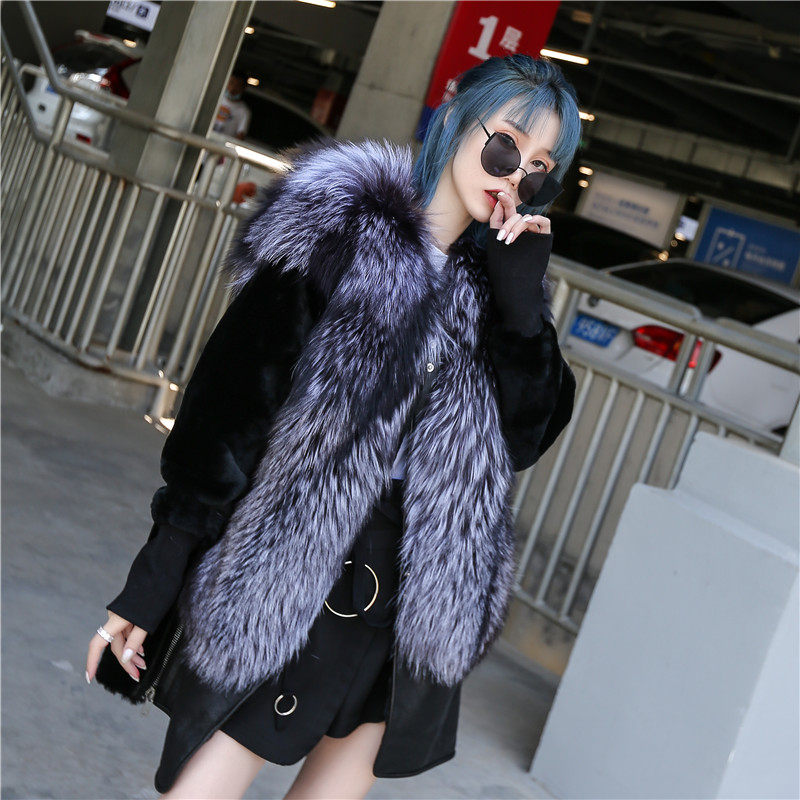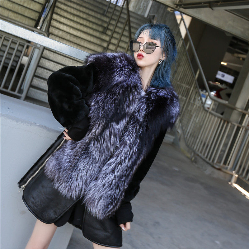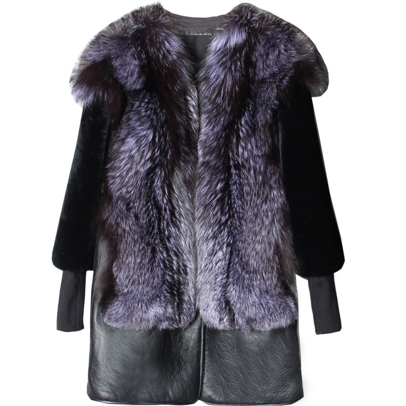 Henin large size leather fur integrated coat female medium long version genuine leather accessories silver fox large coat Korean version of lean lamb fur grass