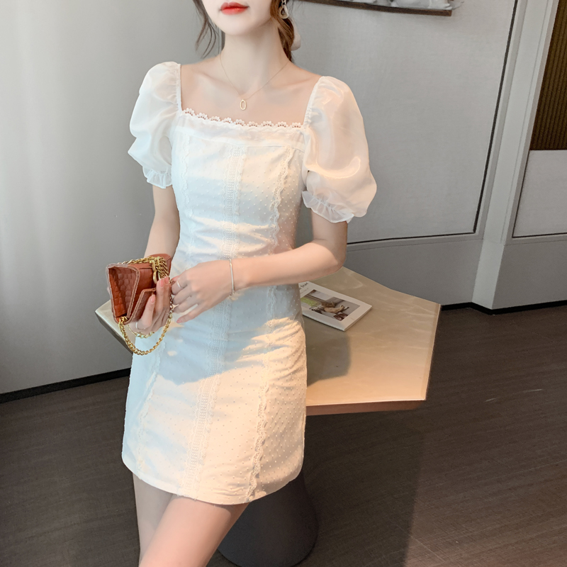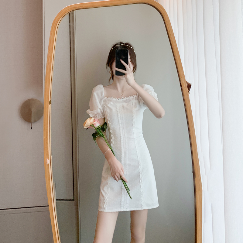2022 new one-shoulder shoulder can be salty or sweet dress waist slim puff sleeve fairy skirt chic square collar