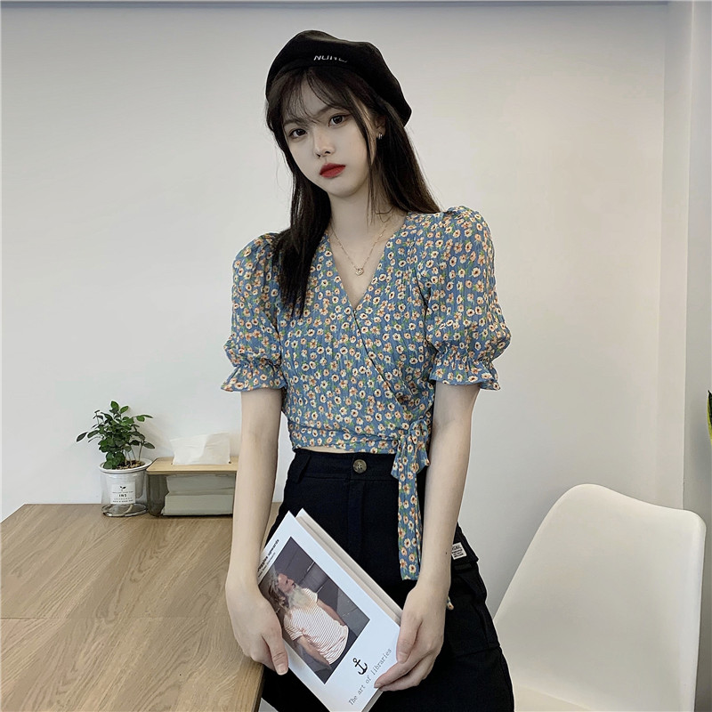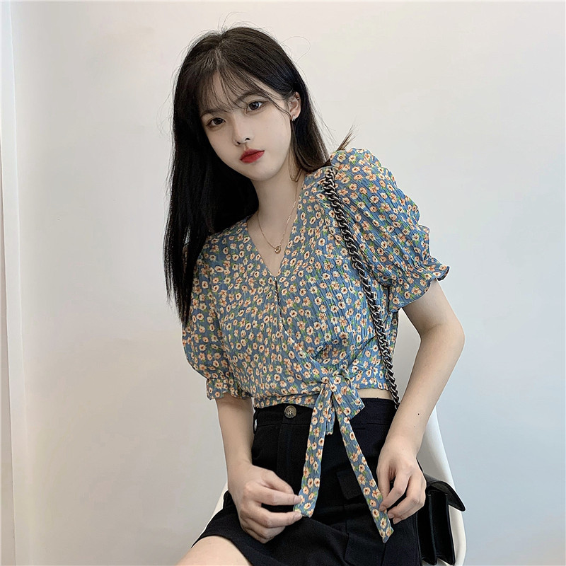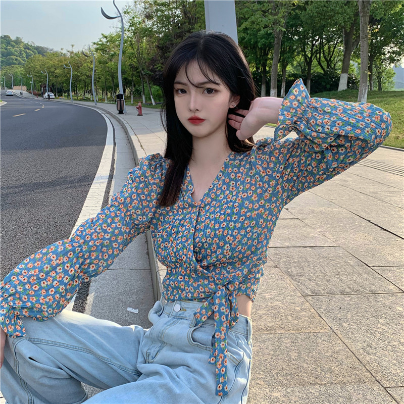 Design sense chiffon shirt 2021 winter new French short V-neck top feminine high-rise floral long-sleeved shirt