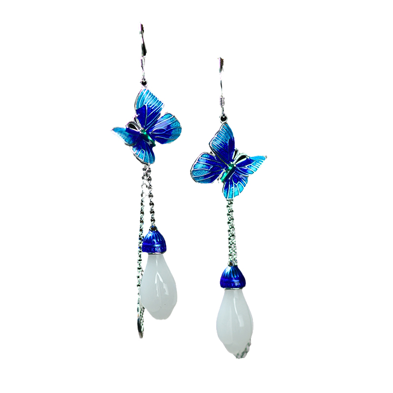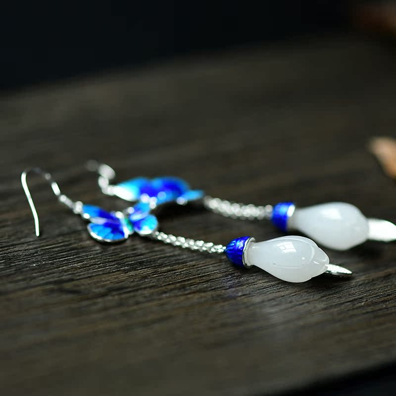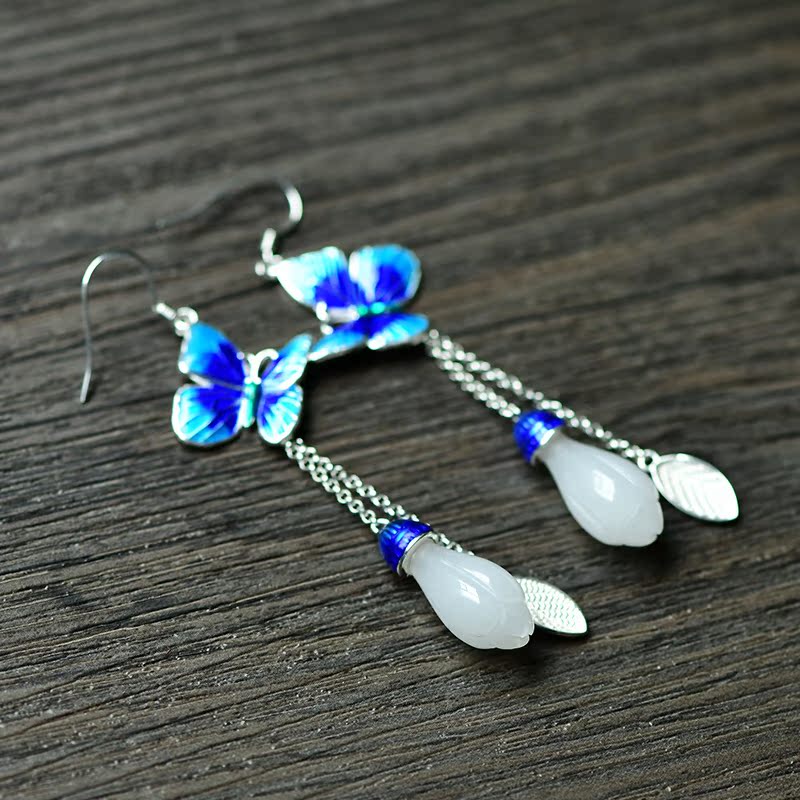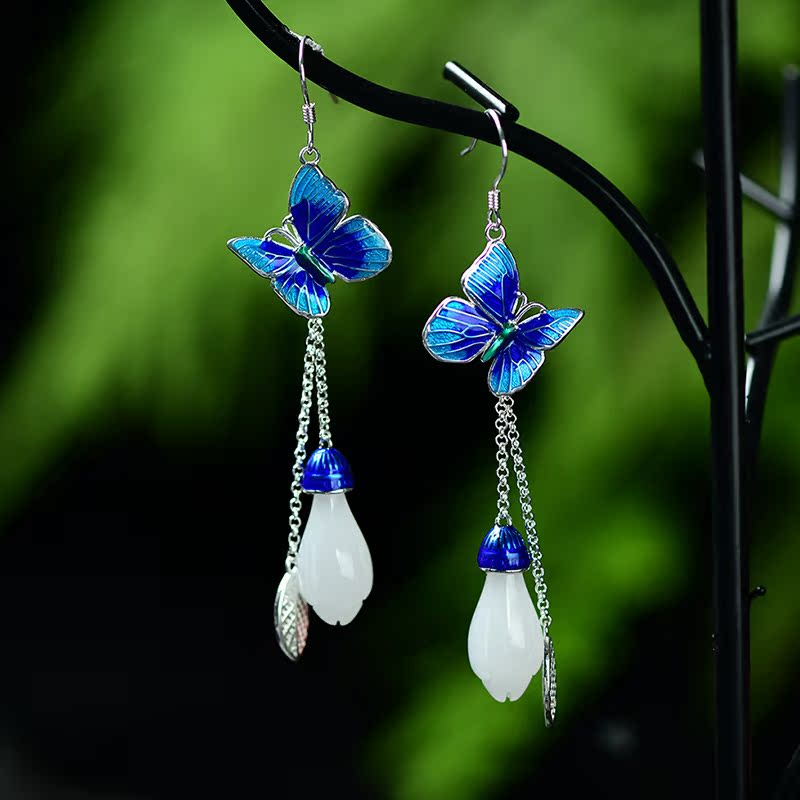 s925 silver inlaid Hetian magnolia flower cloisonne butterfly earrings long version ladies antique silver earrings earrings ear hook earrings