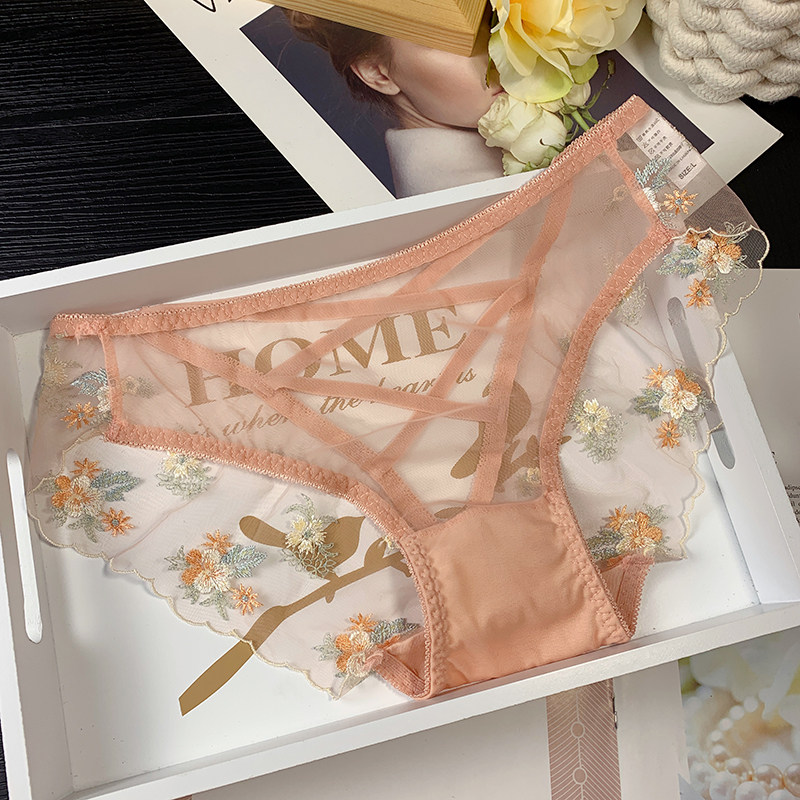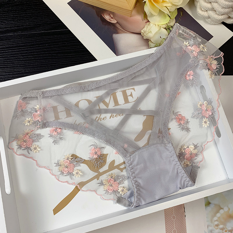 emwz embroidered flower sexy mesh lace underwear women's mid-waist back hollow strap transparent see-through briefs