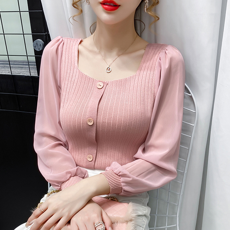 Lantern Sleeves Ice Silk Knit Cardiovert Woman Long Sleeve Thin section 2022 Fall new body Square Collar Splicing Snowspun Blouse Tide
