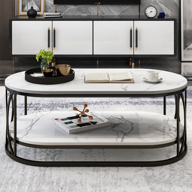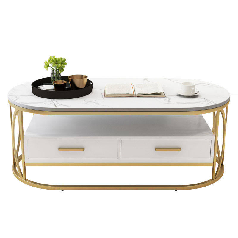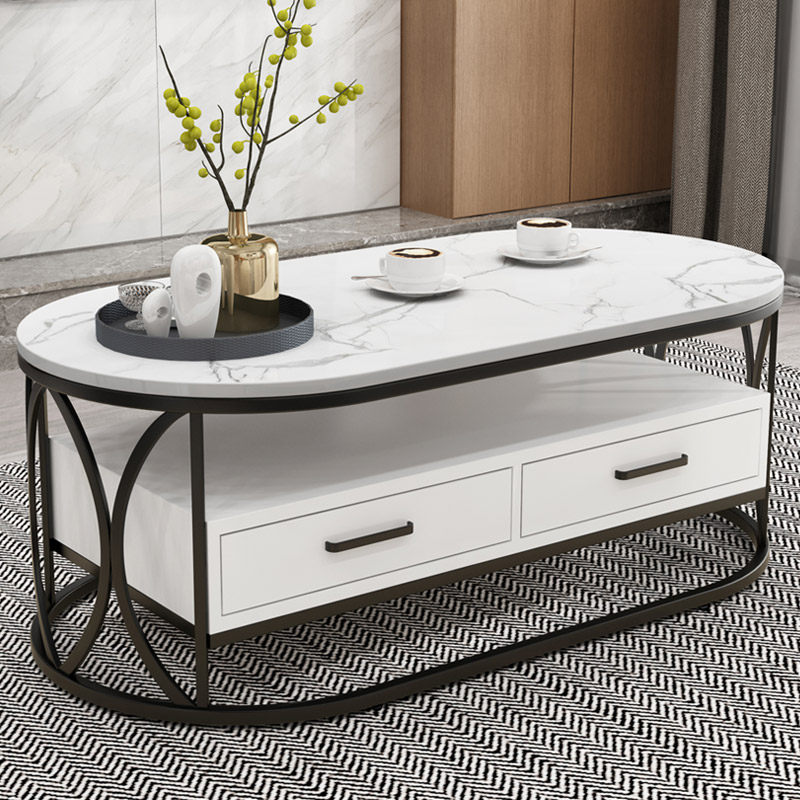 Light luxury Nordic marble coffee table modern minimalist rock slab tea table small apartment oval double-layer home with drawers