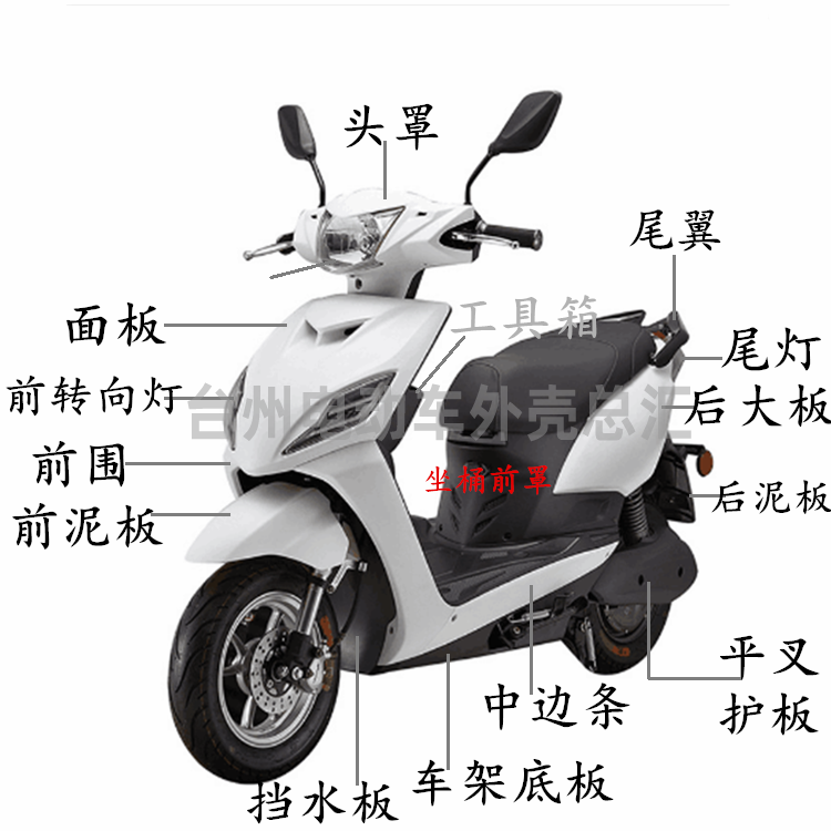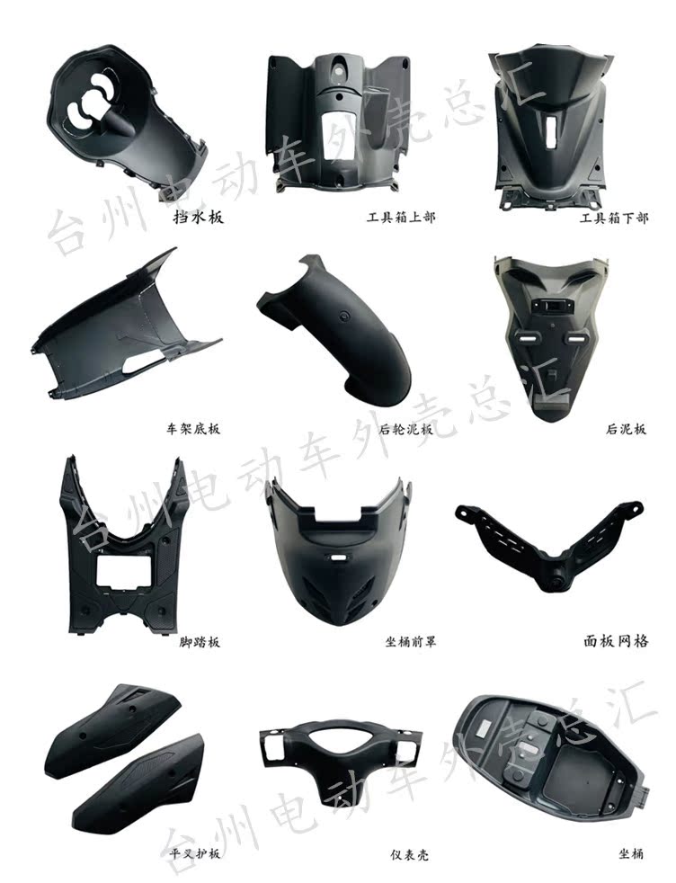 Black gray panel front circumference front mud plate hood middle side strip decorative board connection block toolbox upper toolbox lower water barrier frame base plate foot pedal foot pedal cover seat barrel front cover instrument shell rear wheel mud plate panel mesh