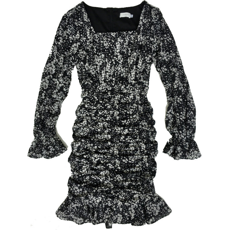 Dress women's 2020 new women's long-sleeved hip skirt floral autumn square collar pleated thin and temperament mid-skirt