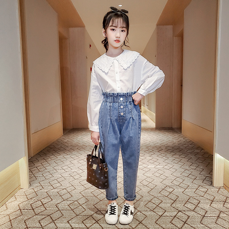 Girls suit 2021 spring and autumn new net red casual long-sleeved shirt ultra-western style jeans wild two-piece set