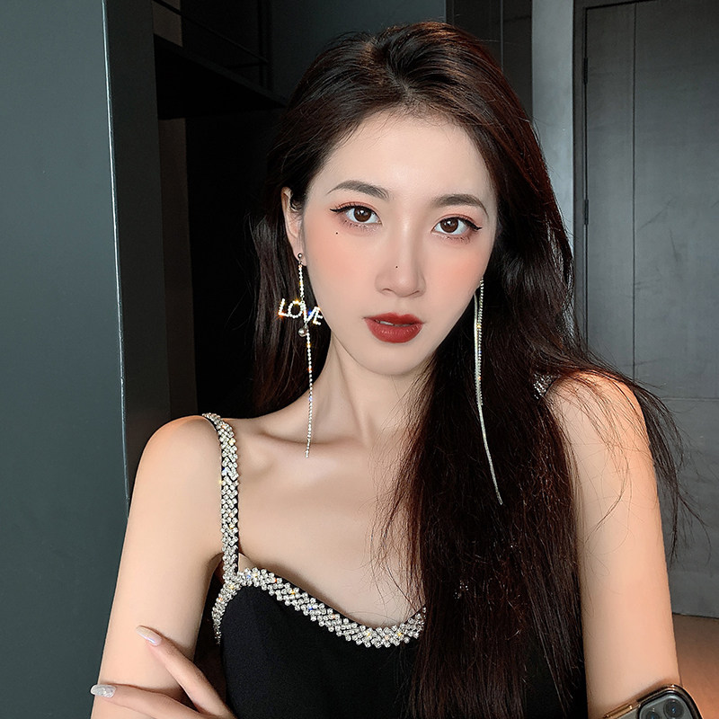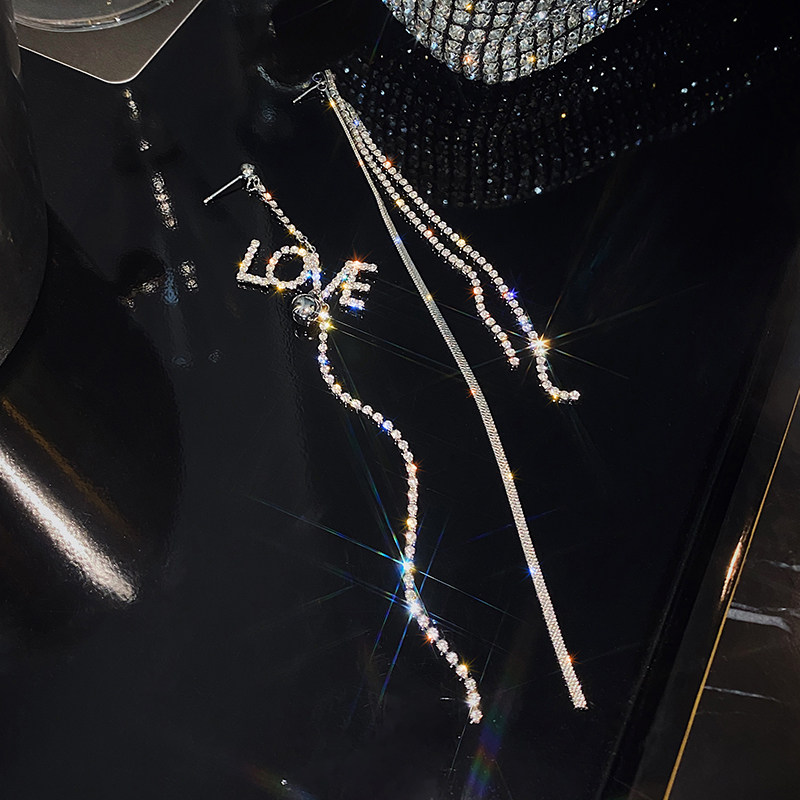 Wang Fried queen ~ European and American diamond letter earrings super long exaggerated asymmetrical temperament net red tide drop earrings for women