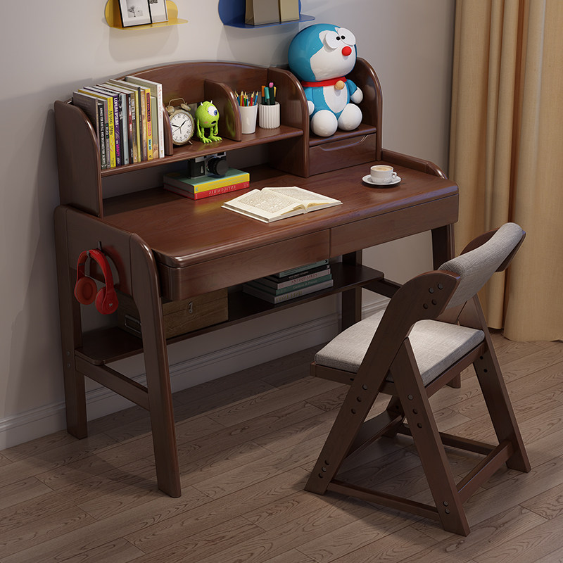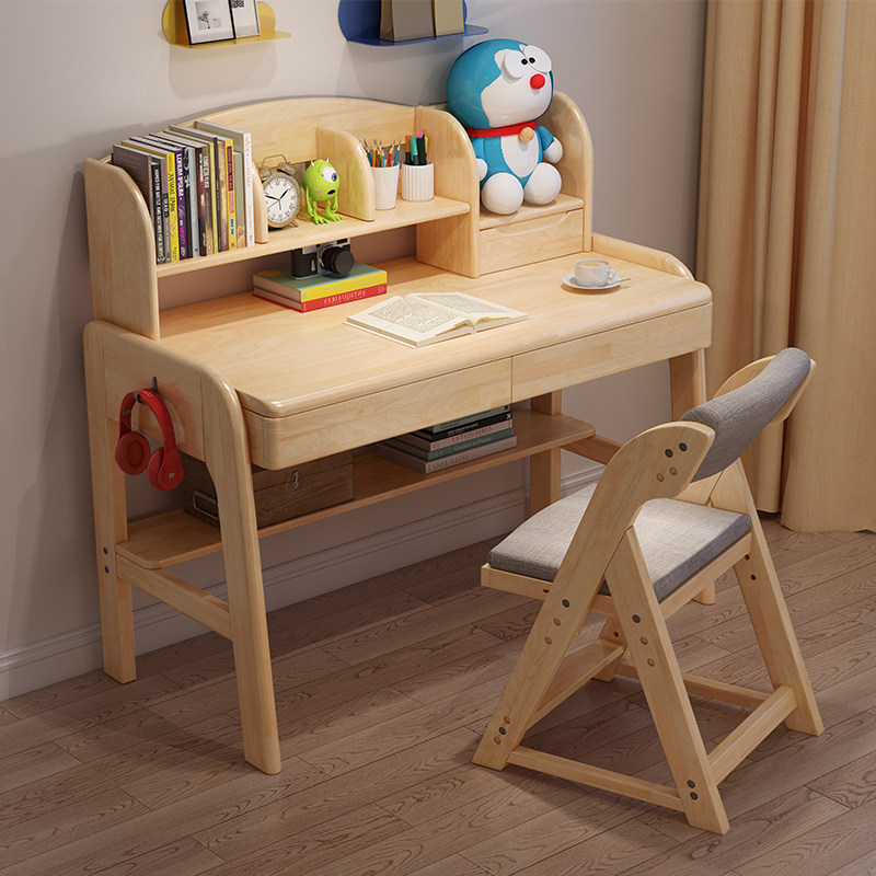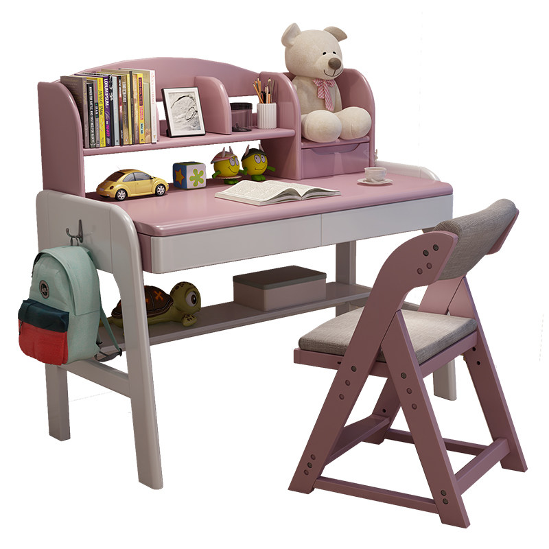 White children's solid wood desk can lift the learning table Primary school student chair Home bedroom simple with bookshelf combination
