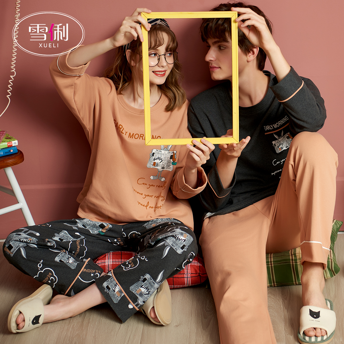 Snow Li homewear autumn set pajamas men spring and autumn thick cotton long sleeves plus size couples wear women's round neck